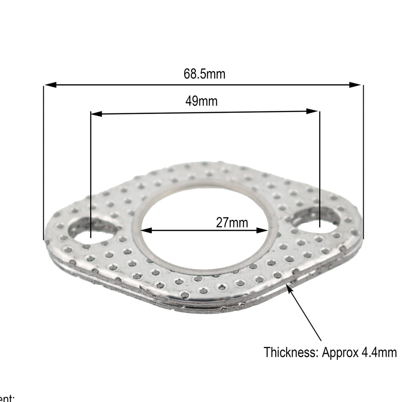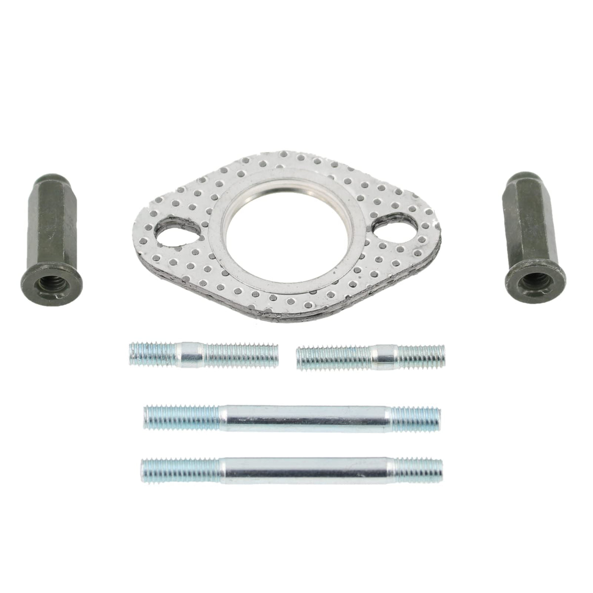 Q: What are the dimensions of the exhaust gasket and studs included in this kit?A: The exhaust gasket has an outer diameter of 30mm, an inner diameter of 21.8mm, and a thickness of 5mm. The included exhaust bolts are M6X32mm (2 pieces), and the intake manifold studs are also M6X32mm (2 pieces), while the exhaust cap nuts are M6X30mm (2 pieces).