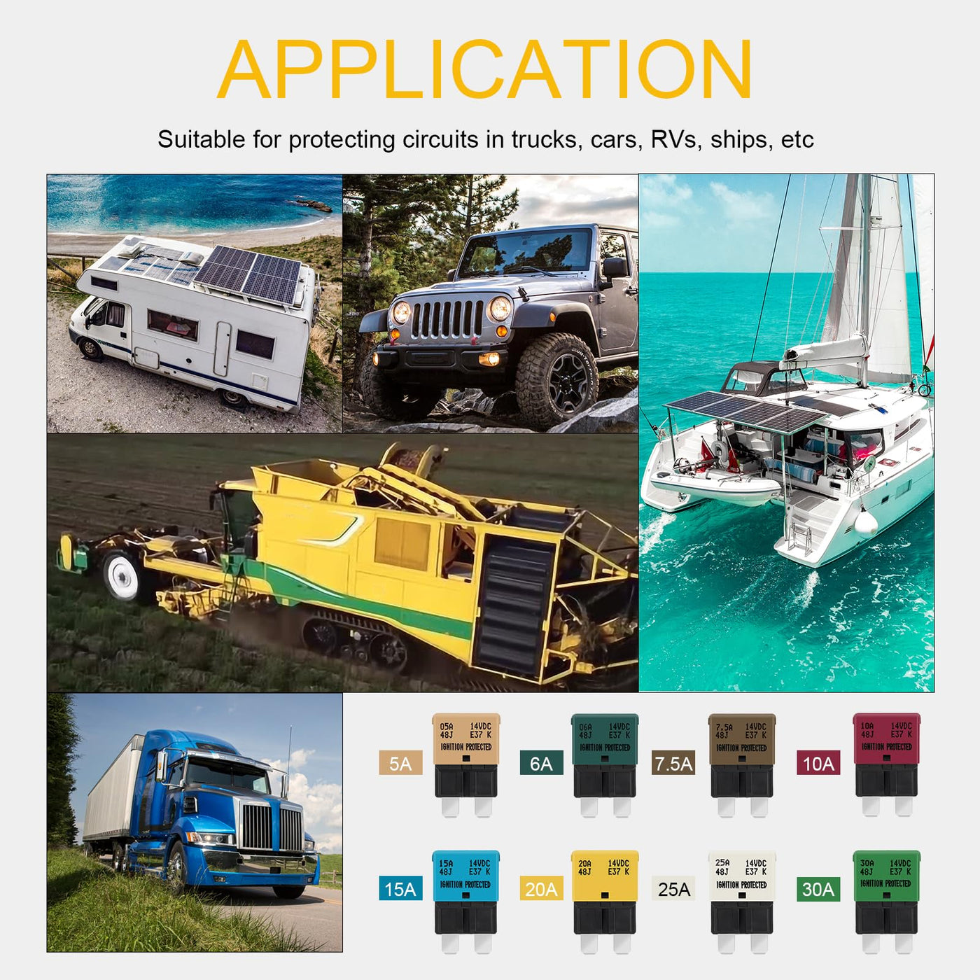 The height (excluding terminals) of this breaker is 1.16'' (29.5 mm) and standard fuse is around 0.48'' (12.19 mm). The breakers are taller and may not fit into some fuse boxes.Single Pole Thermal Type Breakers Rating: 6A, 14Vdc (3 Pack) Operating Temperature Rating: -40F (-40C) to 185F (85C) Storage Temperature Rating: -40F (-40C) to 260F (125C) Materials: UL-Rated 94V0 thermoplastic body. Tin-plated copper alloy terminals Marking: Cover is color-coded to amperage ratings Termination: 5.2mm wide blades compatible with ATC type fuse blocks Compliances: SAEJ553; SAEJ1171 (Ignition protected)