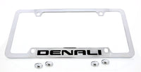 Q: What material is the GMC Denali License Plate Frame made of?A: The frame is made from chrome plated brass metal, ensuring durability and a polished finish.