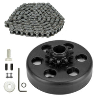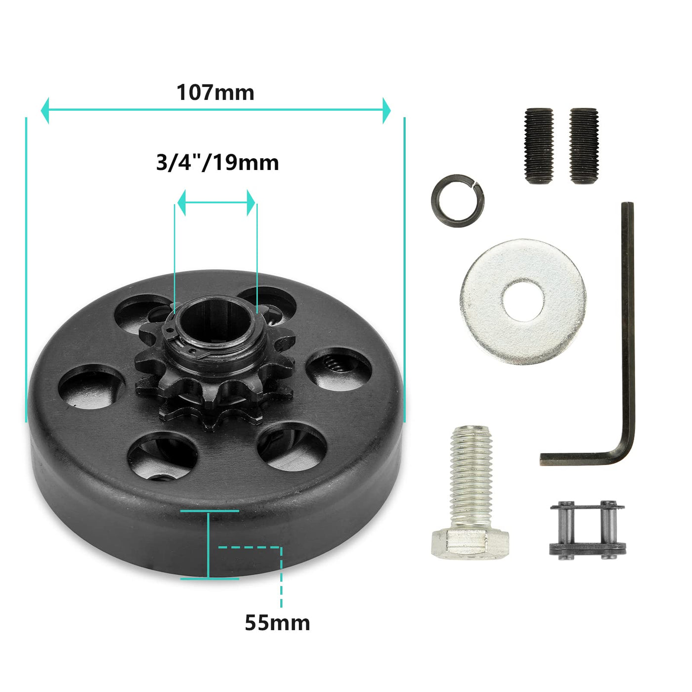 Dimensions: Shaft size: 3/4'' Bore Chain Size: #35 Chain ( 4 Feet ) Tooth Count: 12 Tooth Clutch Diameter: 107 mm Clutch Height: 55 mm Engagement Speed: 2300300 RPM Recommended Engine: 2HP - 6.5HP, 3/4'' shaft with flat key Package Including: 1 x Centrifugal Clutch 1 x 4 Feet #35 Chain 2 x Set Screws 1 x Connecting Link. Compatible with Fits for 2-6.5hp Honda & Honda cloned engines GC160, GC190, GX120, GX140, GX160, GX200 For Briggs & Stratton and 2 - 6.5 HP with 3/4'' Shaft Common clutch for 3.5-7hp engines using #35 Chain Tecumseh Engines 2 - 7 HP with 3/4'' Shaft Other engines with 3/4 crank shaft and 3/16'' key way Most 5.5 HP clones, 6.5 HP clones and 4-7HP motors in all brands