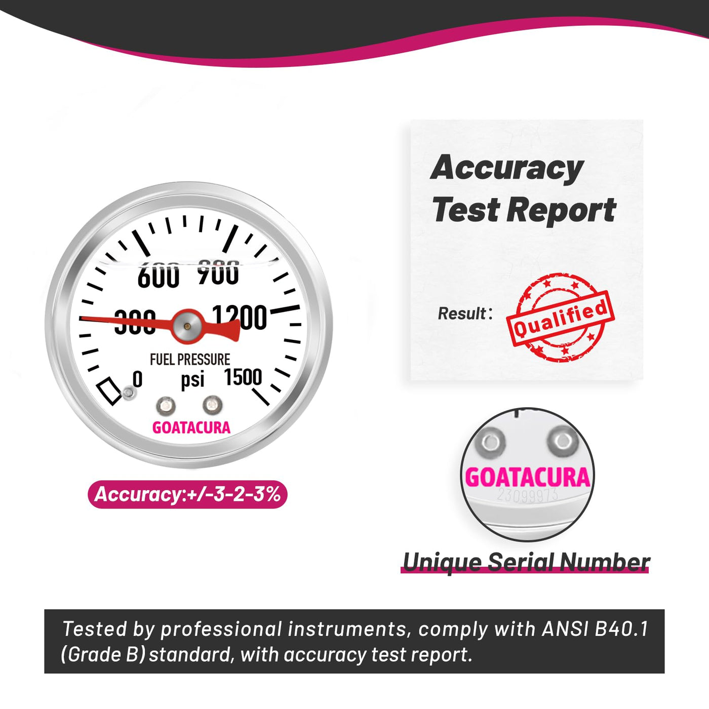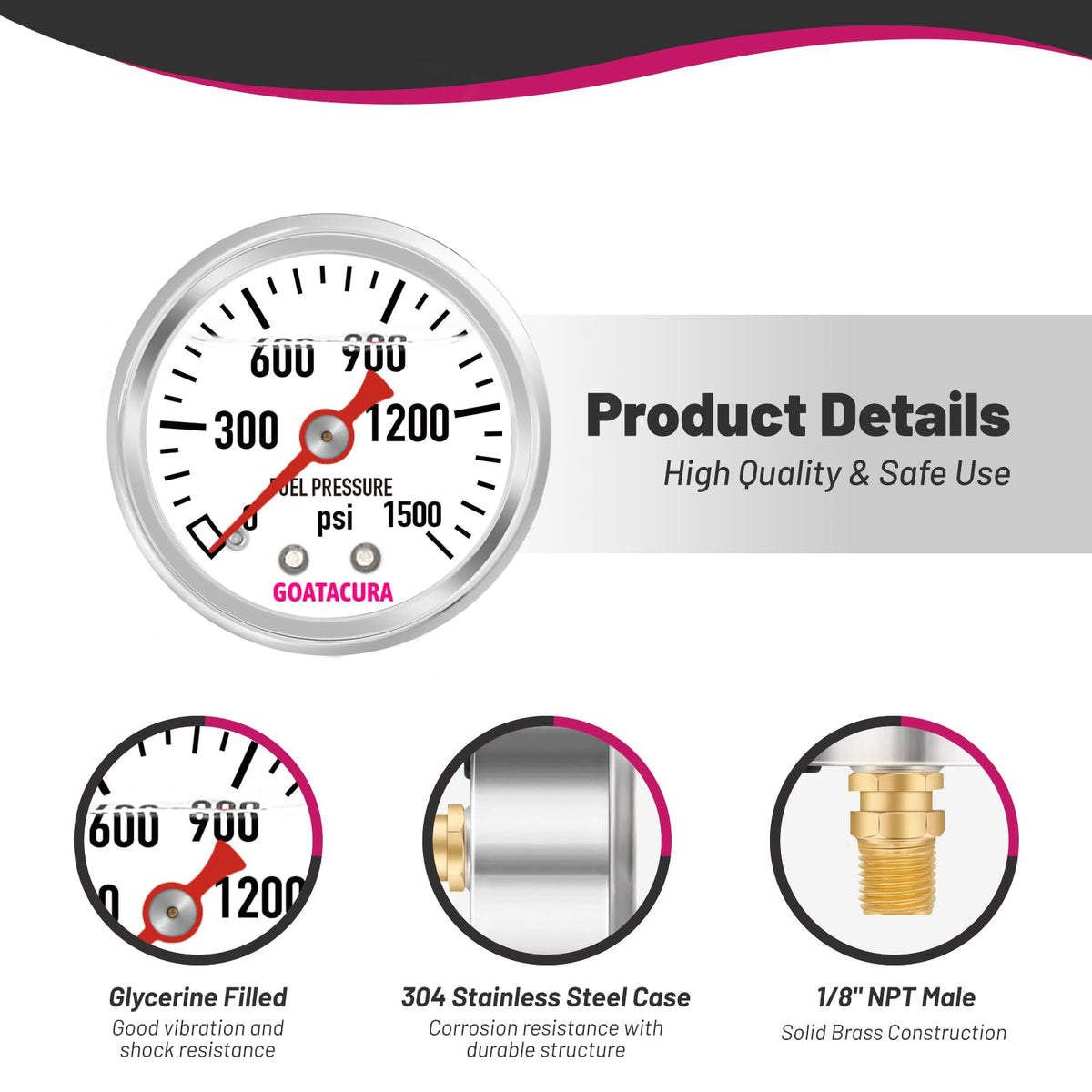 Descriptiongoatacura Liquid Filled Pressure Gauge For Measuring Fuel Pressure, Suitable For Fuel Pressure Regulator, Applicable To Measuring The Pressure Of Liquids And Gases That Are Not Corrosive Or Oxidizing To Brass Parts. Dial Size: 1-1/2'' Thread Size: 1/8'' Npt Pressure Range: 0-1500Psi, Single Scale, Clear Reading Accuracy: +/-3-2-3%, Comply With Ansi B40.1 (Grade B) Standard, With Accuracy Test Report Connection Location: Center Back Mount Connection Material: Brass Case: 304 Stainless Steel Case Filling: Glycerin Filled, Enhance Vibration And Shock Resistance, Extend Product Life Bourdon Tube: Copper Alloy Movement: Brass Dial: Aluminum, White Pointer: Aluminum, Red Window: Polycarbonate Ingress Protection: Ip67, Waterproof Working Temperature: -4 To 140 Deg F/-20 To 60 Deg C Ambient Temperature: 140 Deg F/60 Deg C Maximum Goatacura Is Committed To Research, Develop And Produce Of Temperature, Pressure Equipment Etc Suitable For Various Fields. Goatacura Pursues High-Quality, High-Accuracy And Better Service. We Pay High Attention To The Feedback And Needs Of Users. We Continue To Learn And Innovate, And Create Better Products.