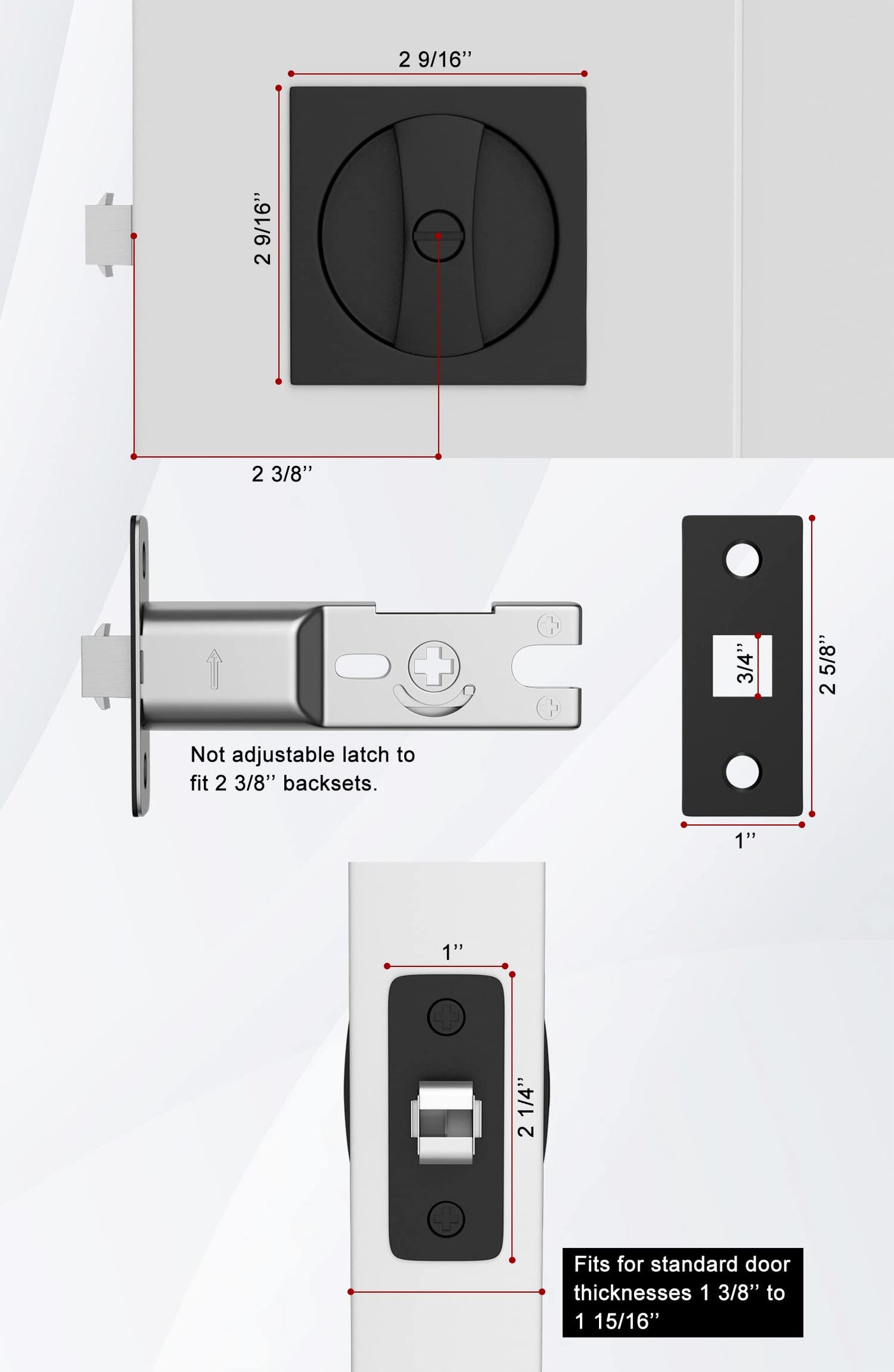 Goldenwarm Bed/Bath Pocket Door Lock, Matte Black Contemporary Privacy Square Pocket Door Hardware(2-3/8' Backset), Black Flush Pocket Door Latch(1 Pack)