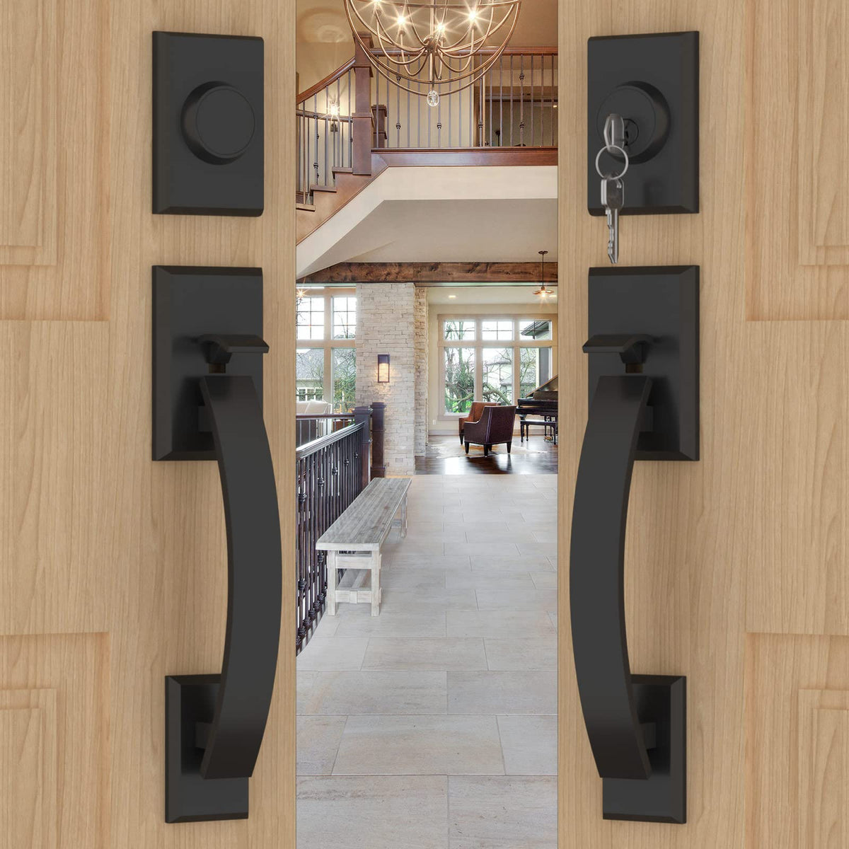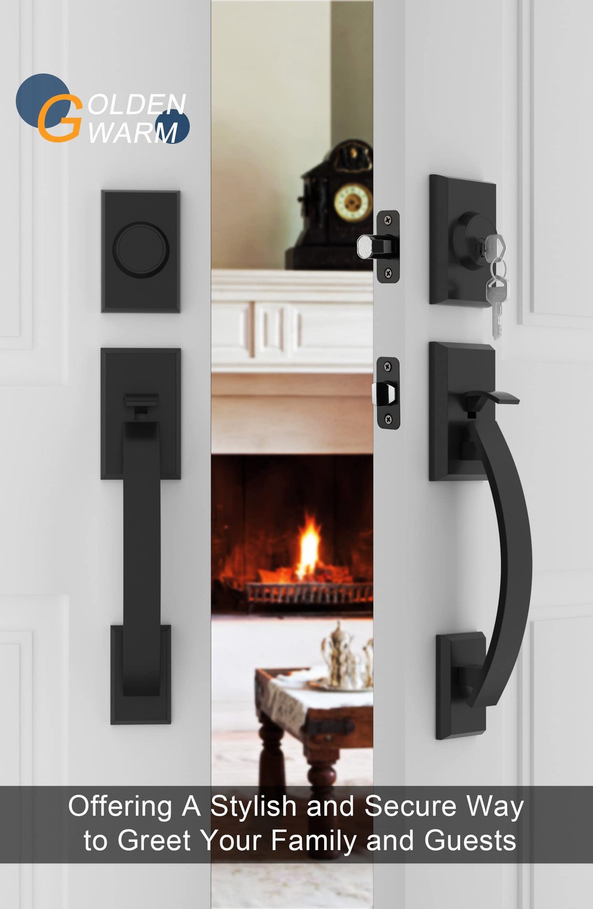 Q: How does the reversible handle lever work on this lock set?A: The reversible handle lever on the goldenwarm Double Front Door Lock Set allows for easy installation on both left and right-hand doors. This feature enhances usability and makes it a great choice for any entryway configuration.