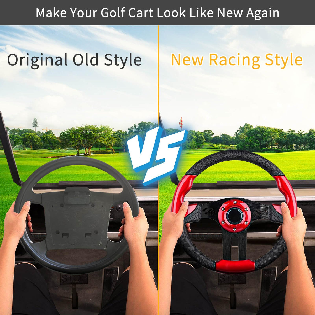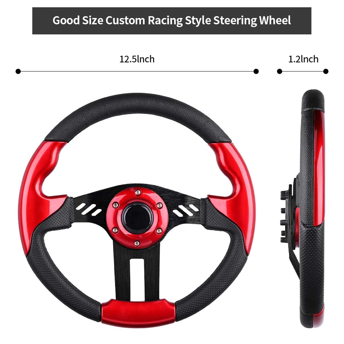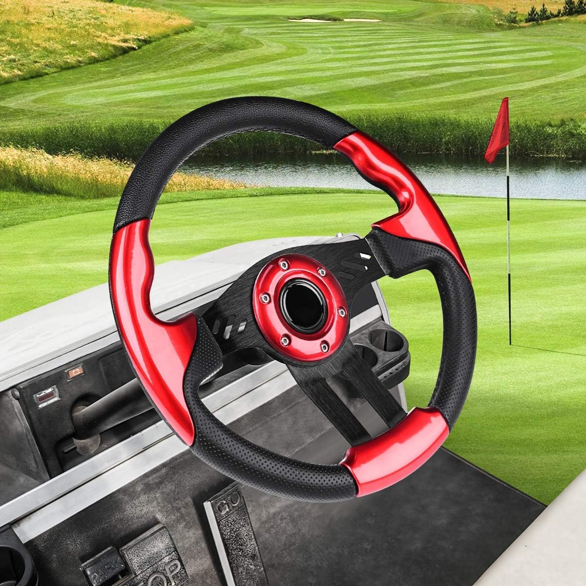 Q: What is the diameter of this golf cart steering wheel and why is it important?A: This golf cart steering wheel has a diameter of 12.5 inches. This size is ideal for providing a sporty feel while ensuring that it fits comfortably within the steering column of various golf cart models, enhancing your overall driving experience.