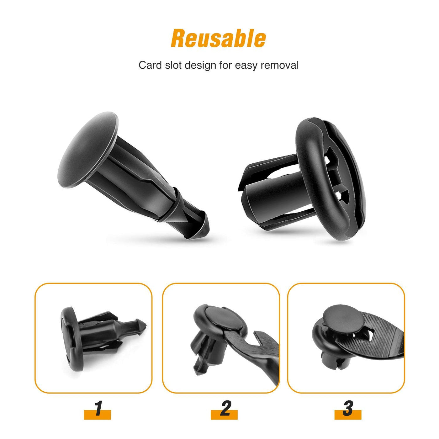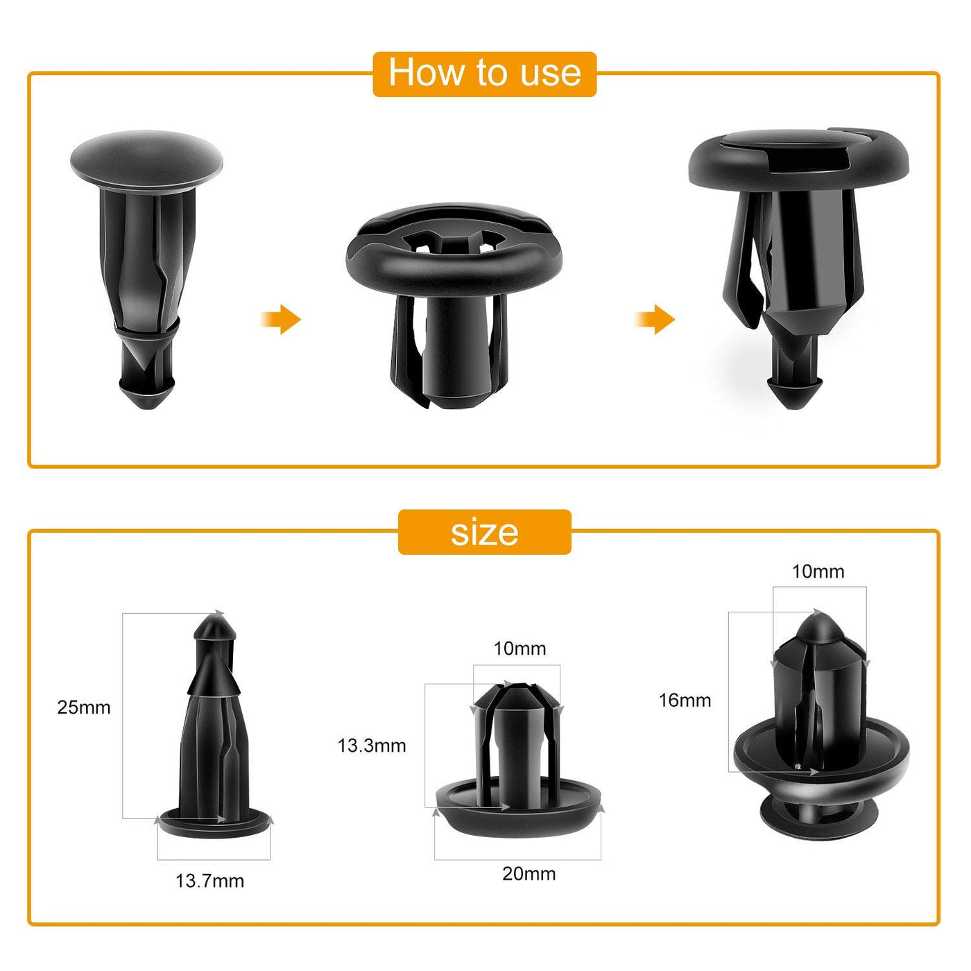 Q: What is included in the package of the GOOACC fender rivet clips?A: The package includes 100 pieces of the GOOACC fender rivet clips along with 1 fastener remover. This comprehensive set ensures you have enough clips for multiple repairs or replacements, making it a cost-effective solution for your automotive needs.