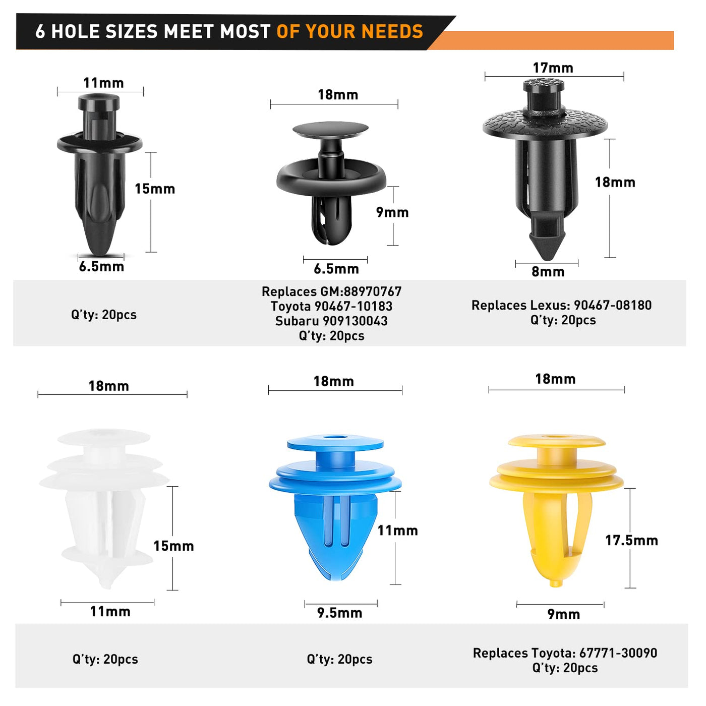 Gooacc 120Pcs Car Bumper Retainer Clips & Fasteners Rivet Kit 6.5Mm 8Mm 9Mm 9.5Mm 11Mm For Toyota Dashboard Panel Front Fender L