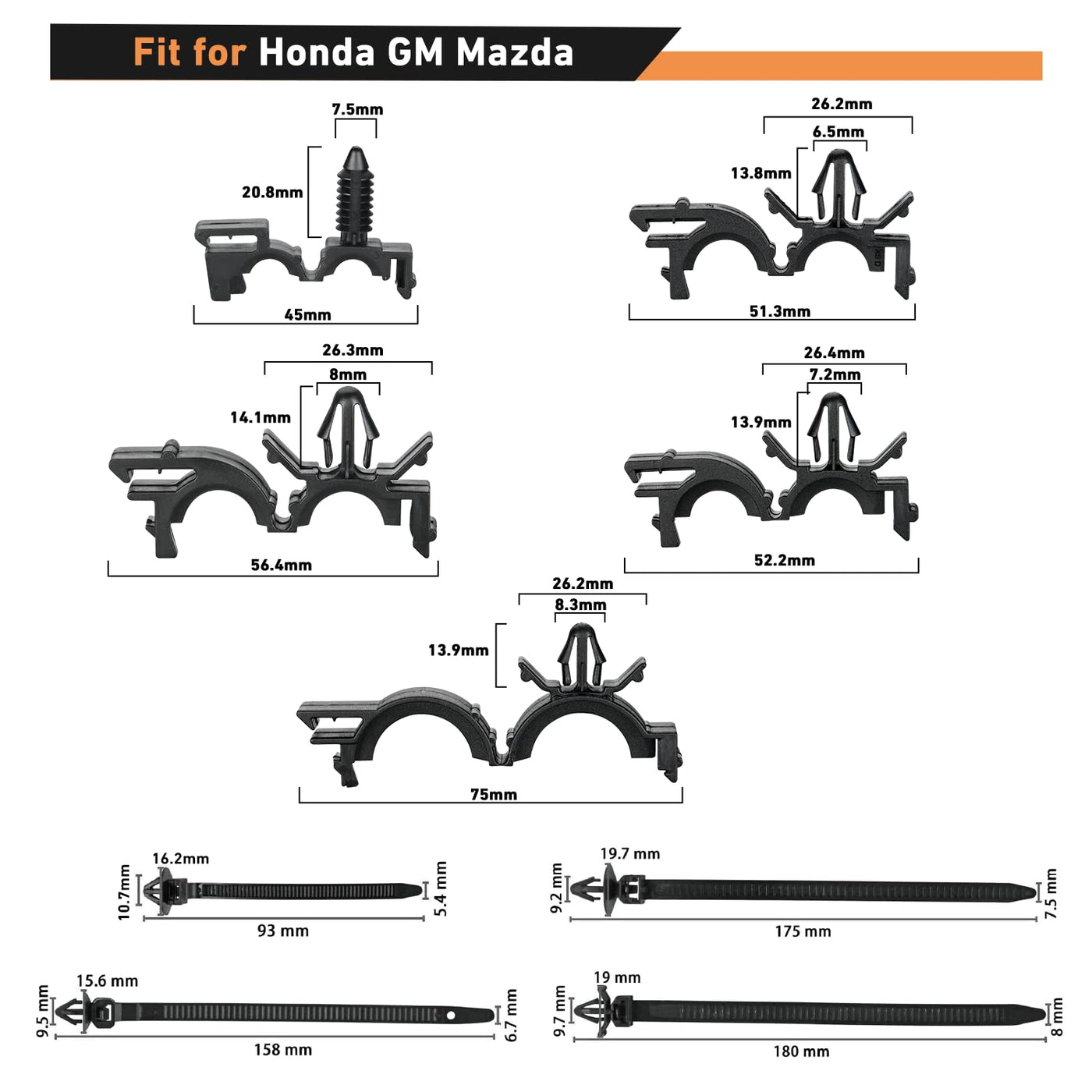 ?High Quality Material?- GOOACC Wire Harness Routing Clip Assortment set is Made of high quality Nylon, durable enough for you to hanging items, More stronger,robuster and vibration resistant ,would not break or crack easily. So the product appearance is exquisite, perfect workmanship. | ?Great Value?- Our Auto Wire Routing clips kit includes 90pcs contains 5 different sizes car clips and 40Pcs car cable ties 4 different sizes for Honda GM Mazda's. Not just for these cars, if the sizes and shape meet your needs well, it's also a useful kit. | ?Universal Fit For Nissan?- The Car Body Clips are are sized and shaped to fit your requirements. Universal shape and size will meet all your needs. | ?Save Time And Money?- These car clips can suitable for most of the car use, Comes with a plastic box with compartments for organized storage,Don't worry about lost or damaged body fasteners. | ?Satisfaction?-Please check the size of the products pictures,type and shape to make sure the item is the one that you need.If you have any problems ,please feel free to contact with us, we will reply to you within 24 hours.