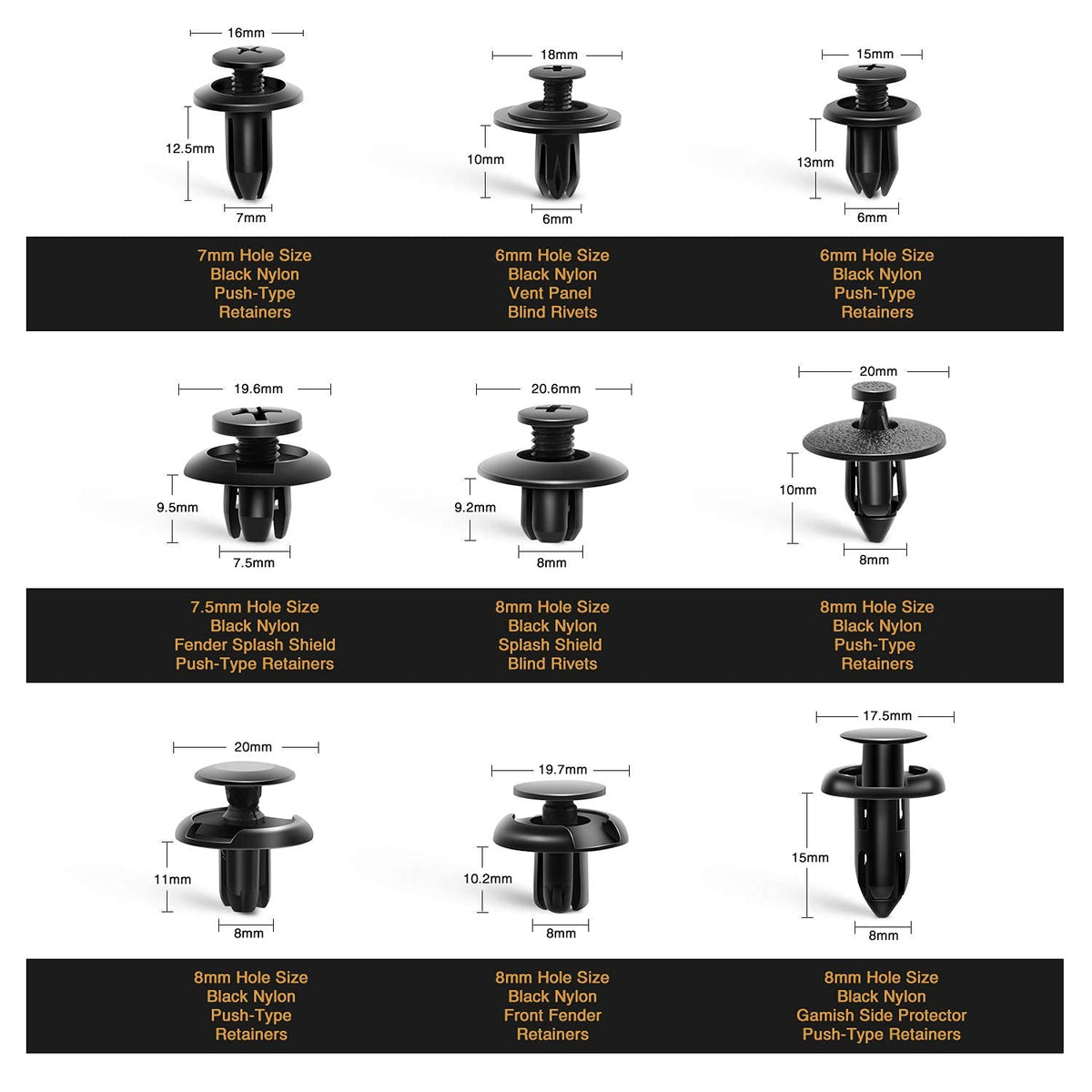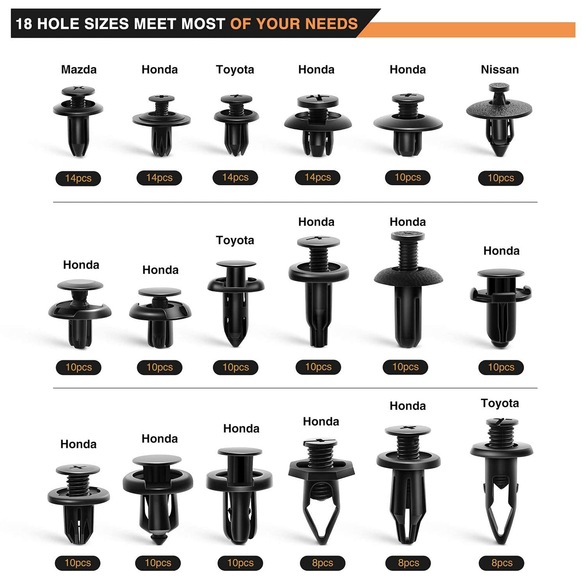 Q: What sizes are included in the 190 PCS retainer clips kit?A: The kit includes 18 different sizes of clips, each designed for specific applications such as door trim, bumpers, and fenders, providing a comprehensive solution for various needs.