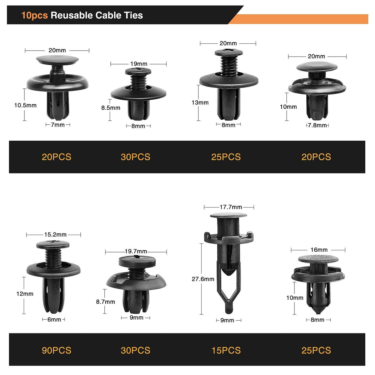 Color: black Material: Nylon Retainer Sizes: 16 most Popular Sizes, 620 pcs /set Package weight: 1kg Packing List: 620PCS auto car body Retainer clips 1PC premium nylon fastener rivet clips removal tool 4PCS Car Panel removal tools trim removal tool 5PCS Longer plastic cable ties 5PCS Shorter plastic cable ties 1 x Plastic Storage Carry Case Note: Please check the size, type and shape in the pictures and description first to make sure the item is the one that you need.