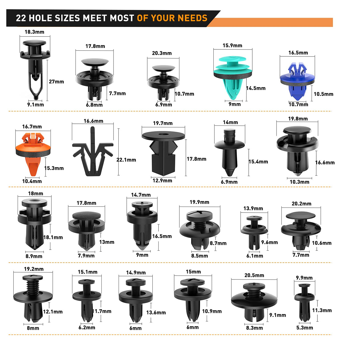 Q: How do I choose the right size of retainer clips for my car?A: This kit includes 22 different sizes of auto plastic rivets, suitable for OEM replacements in 6-10mm hole sizes. To choose the right size, refer to the detailed size chart provided in the product images, and compare it with the existing clips in your vehicle.