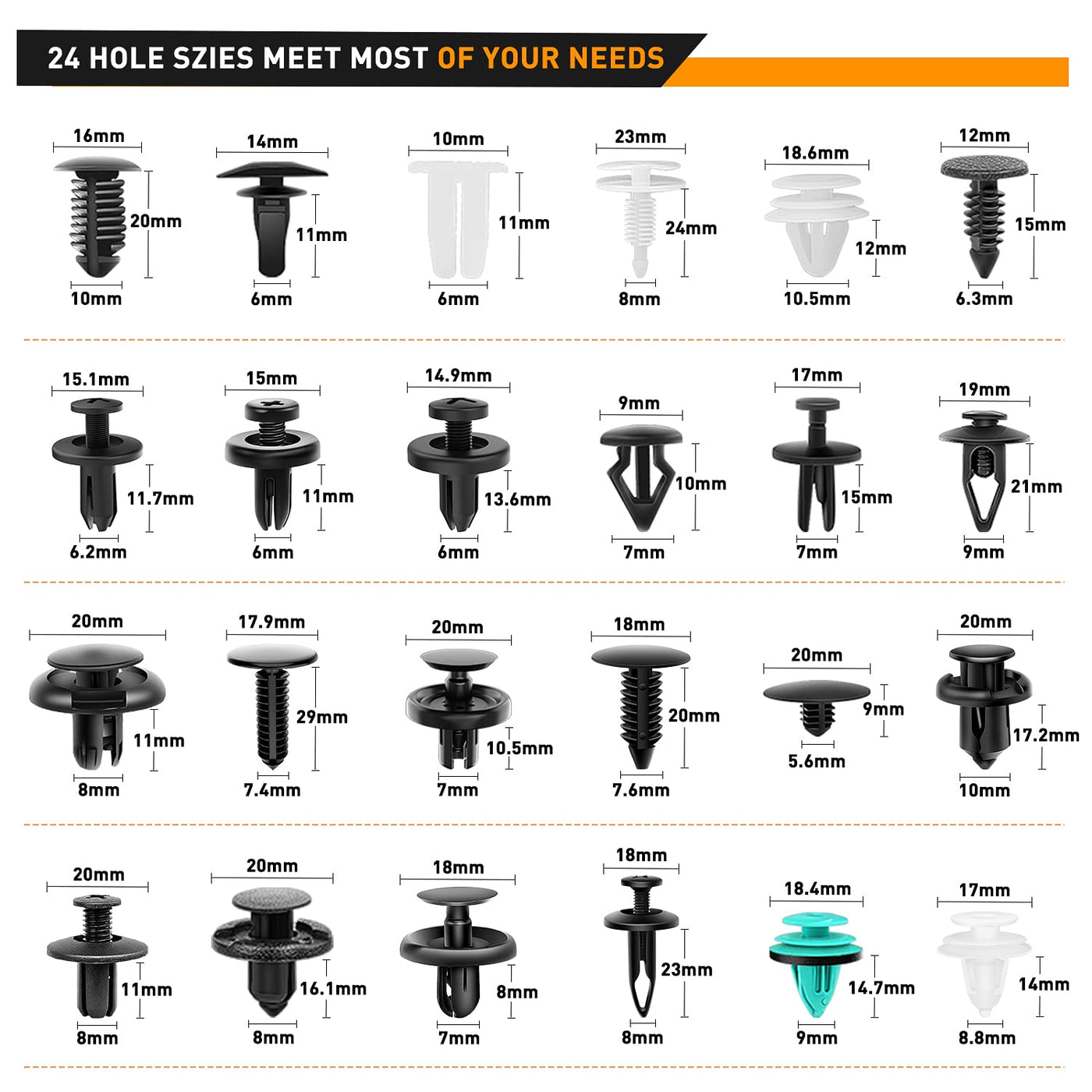 GOOACC Professional Push Retainer Kit has a total of 800pcs car retainer clips including 24 most common pin clips to meet your various needs of car interior trimming.Made of impact resistant nylon fiber material,it is non-toxic and breakage proof, allowing you to widely use on door trim, car panel, radiator shield, splash shield, fender or bumper, our auto fastener clips are suitable for most vehicles.Nice to have s pares on h and m aybe you don't need all of them at a moment, but it will be nice to have spares on hand for some urgent needs. When you need to do some additional repairs/changes to your vehicle interior accessories, it's definitely a good helper. It better saves your time and money spending on a repair shop.Due to display problems, there may be a slight color difference.Note: Please check the size, type and shape in the pictures and description first to make sure the item is the one that you need, contact us if you have any questions.