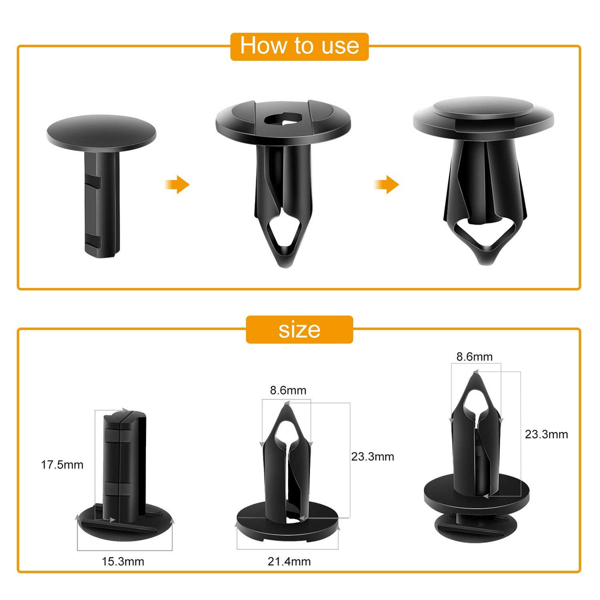 Q: How do I install the GOOACC GRC-18 expansion screws?A: To install the GOOACC GRC-18 expansion screws, simply align the screw with the hole of the panel or component you are securing, push it into place, and ensure it is seated properly. These push clips are designed for easy installation without the need for additional tools.
