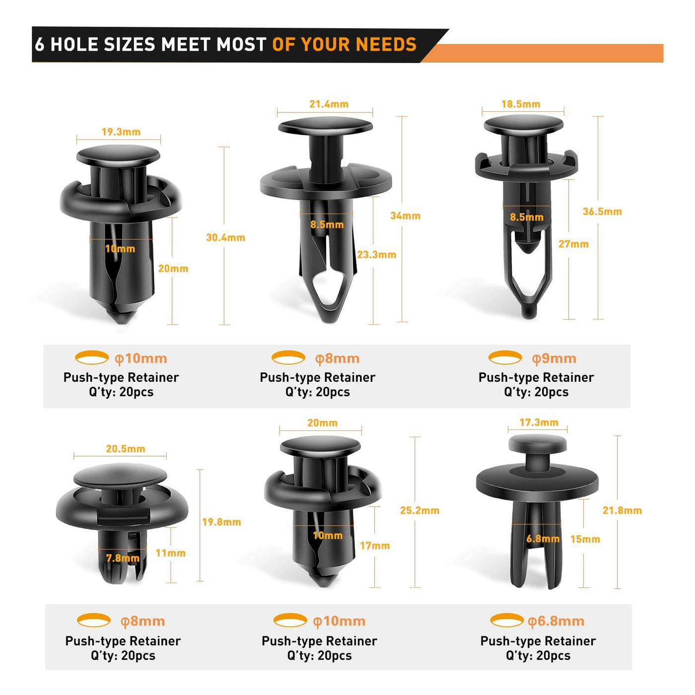 From the manufacturer GOOACC is a famous brand that dedicated to providing innovative, cost-effective and quality products. We have been specialized in automotive products and parts for many years. Constant improvement and innovation is our eternal aim. Hope you can purchase with satisfaction here. Specification: Universal fastener clips and remover 4 Whole sizes from 6.4 Mm (1/4''), 8mm (5/16 ), 9mm (23/64 ), 10mm (25/64 ). 6 different Push pin rivet for many brand vehicles. Material: Made of durable nylon. Suitable for car use better replacement for original bumper and fender clips. Push in type, easy to fasten bumper fender flare and mud flap. Rivet post pressure expands legs for fast and tight fastening. Features Tough Fastener Removal Tool Allow you to quickly and easily remove car door panel and upholstery clips without causing damage to them. Multiple Application Locations A must have for any four wheeler owner to keep those fenders and splash guards attached and intact. Removable and Reusable Holds securely but is easily removed without damaging it for reuse. Just pop the post out with a fastener remover. Size: 120Pcs Car Retainer Clips plus Fastener Remover Specification: material: black nylon, suitable for car Use better replacement for original old worn broken one. Push type, easy to fasten.