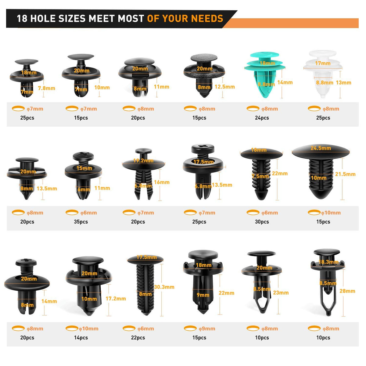 Gooacc - Grc-34 Push Bumper Fastener Rivet Clips With 18 Most Popular Sizes Auto Push Pin Rivets For Benz, Bmw, Toyota, Honda, S