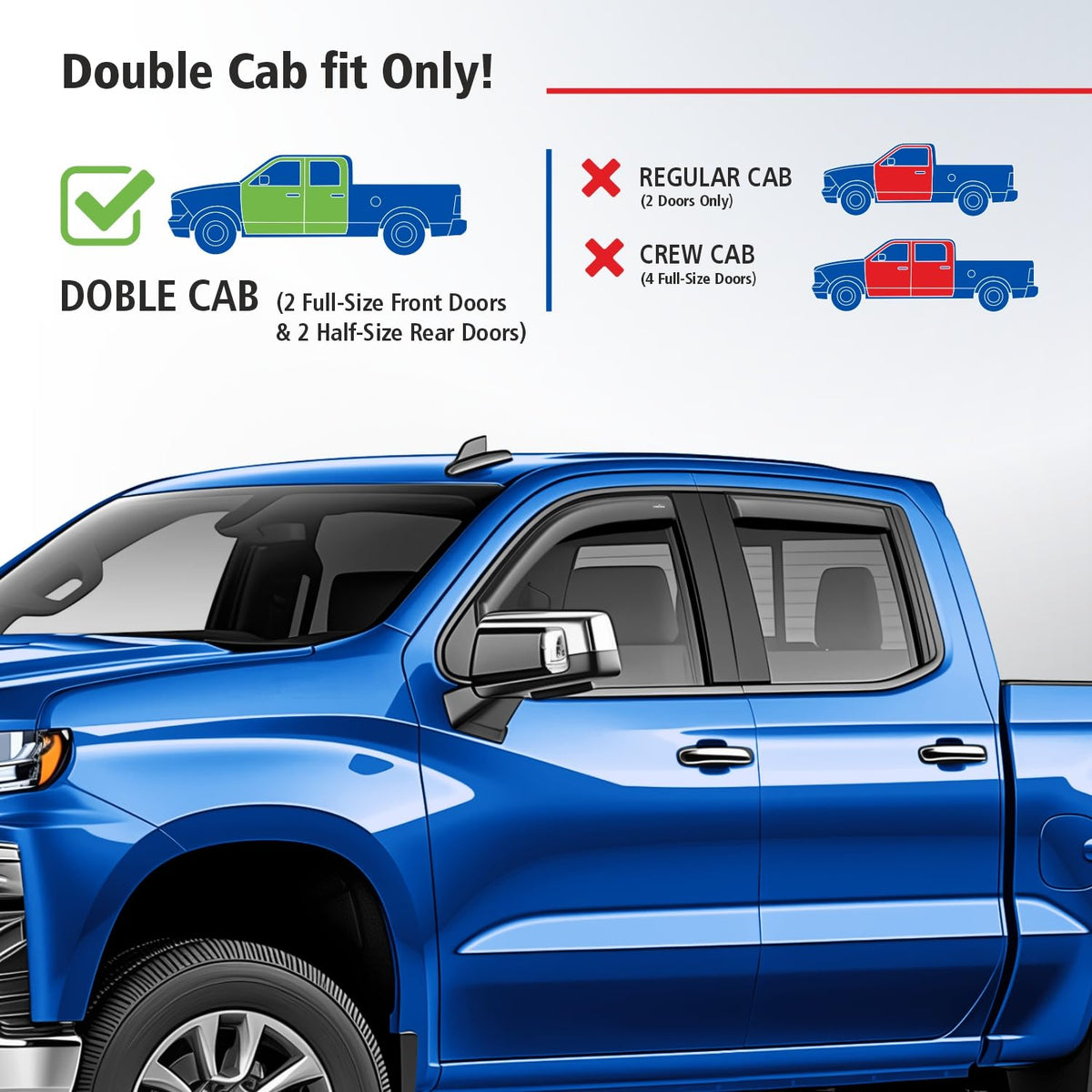 Goodyear shatterproof side window deflectors the famous high quality rain guards that let you drive with your window down in rain, snow, ice and other inclement conditions. Product features: - Made from durable, shatterproof polycarbonate; - Allows fresh air circulation; - Protects from rain and snow; - Great for hot days and smokers; - Backed by Limited Lifetime Warranty; - Gives your vehicle a cool upgraded look; - Car wash friendly. Provides a custom fit FOR: - Chevrolet (Chevy) Silverado 1500 2019-2025 Double Cab; - GMC Sierra 1500 2019-2025 Double Cab. Package includes: 2 Front deflectors, 2 Rear deflectors,Fastening brackets, Metal plate and plastic blade, Degrease wipes, Installation instructions, Branded Goodyear color box, Protective shipping box. 100% money guarantee ensures this will be your best bet for a pleasing no-risk purchase. Many customers love these Goodyear Window Guards so much they return to buy more. This makes a much appreciated gift for friends, family, and co-workers.