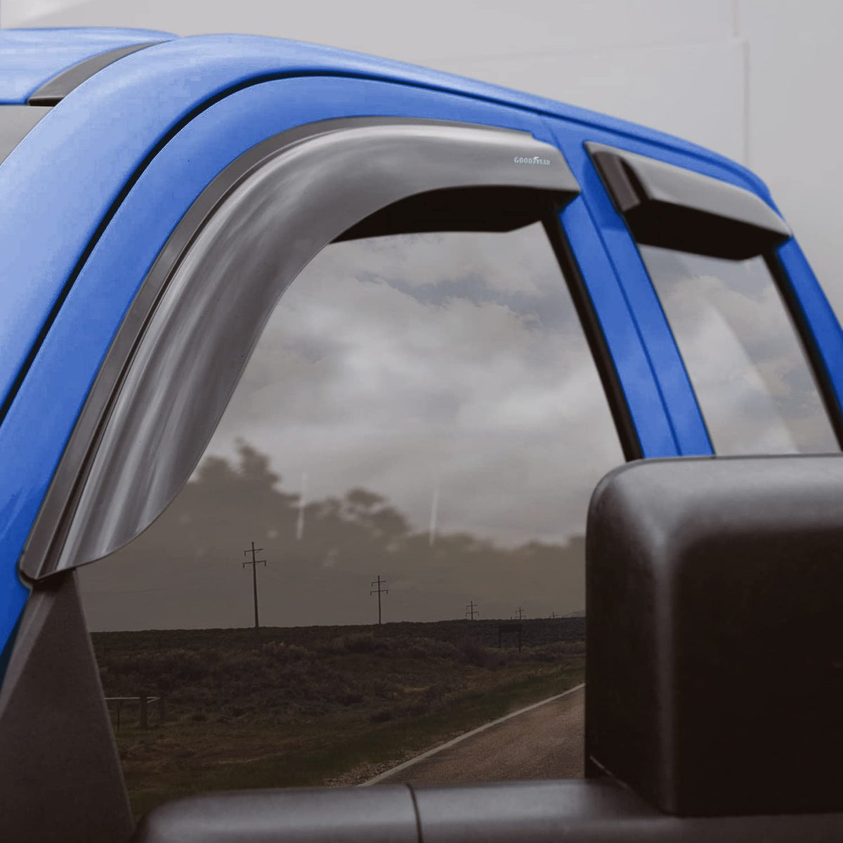 Goodyear Shatterproof Side Window Deflectors The Famous High Quality Tape-On Rain Guards That Let You Drive With Your Window Down In Rain, Snow, Ice And Other Inclement Conditions. Product Features: - Made From Durable, Shatterproof Polycarbonate; - Allows Fresh Air Circulation; - Protects From Rain And Snow; - Great For Hot Days And Smokers; - Backed By Limited Lifetime Warranty; - Windows Close Tightly; - Fits On Top Mirror Mounts, No Need To Remove; - Gives Your Vehicle A Cool Upgraded Look; - Car Wash Friendly. Provides A Custom Fit: - Chevrolet (Chevy) Silverado 1500 2014 2015 2016 2017 2018 Double Cab; - Chevrolet (Chevy) Silverado 2500 2015 2016 2017 Double Cab; - Chevrolet (Chevy) Silverado 2500 Hd 2015 2016 2017 2018 2019 Double Cab; - Chevrolet (Chevy) Silverado 3500 Hd 2015 2016 2017 2018 Double Cab; - Gmc Sierra 1500 2014 2015 2016 2017 2018 Double Cab; - Gmc Sierra 2500 Hd 2015 2016 2017 2018 Double Cab; - Gmc Sierra 3500 Hd 2015 2016 2017 2018 Double Cab. Package Includes: 2 Front Deflectors With 3M Vhb Tape Applied, 2 Rear Deflectors With 3M Vhb Tape Applied, 2 Degrease Wipes, Installation Instructions, Branded Goodyear Color Box, Protective Shipping Box. 100% Money Back Guarantee Ensures This Will Be Your Best Bet For A Pleasing No-Risk Purchase. Many Customers Love These Goodyear Window Guards So Much They Return To Buy More. This Makes A Much Appreciated Gift For Friends, Family, And Co-Workers.