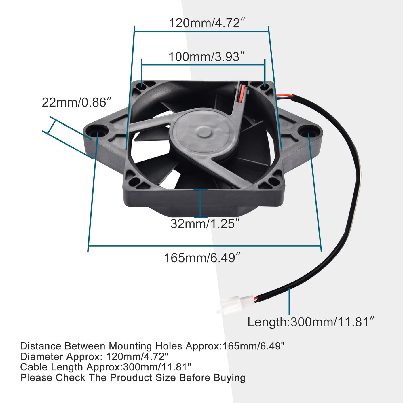 Distance Between Mounting Holes Approx:165mm/6.49;Diameter Approx:120mm/4.72;Cable Length Approx:300mm/11.81(Please Check The Prouduct Size Before Buying). | 12V DC Square Radiator Cooling Fan replacement for Motorcycles. | The 12V DC Electric-Cooled Cooling Fan Has A 7 Pieces Fan Blade,Anti-Parabolic Leaf Design,Uniform Chopped Airflow,Quickly Remove The Heat of The Engine,Extend The Life of The Engine. | Super Strong Motor,Safe And Stable,Strong And Durable,Easy to Dissipate Heat. Voltage: 12 Volts,<1A,DC, 2 Wires/Brand New. | Warranty:We Are Always Available To Help Our Customers.If You Are Not Satisfied With The Order,Please Leave Us A Message.Wish You Have A Happy Shopping Experience,We Are Committed To Providing The Best Service.
