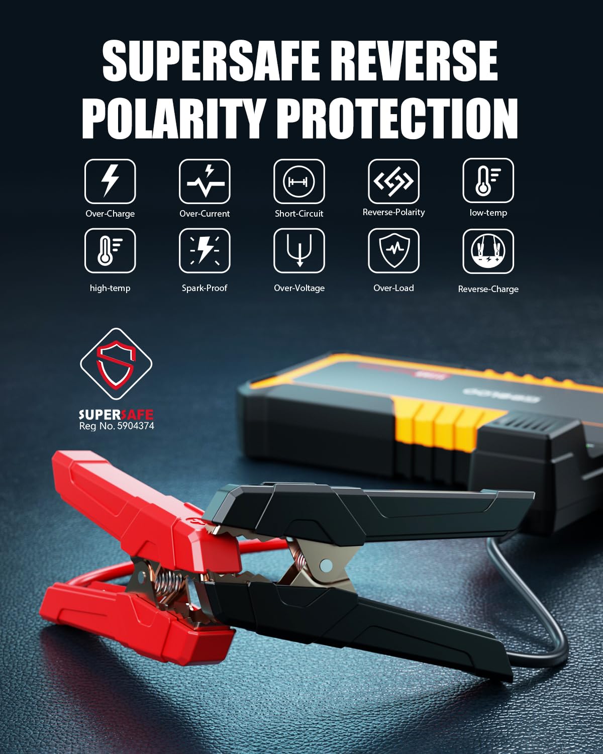 Q: Is the GOOLOO GP3000 safe to use with lithium ion batteries?A: Yes, the GOOLOO GP3000 is specifically designed with safety features for lithium ion batteries, ensuring safe operation while boosting your vehicle's battery.