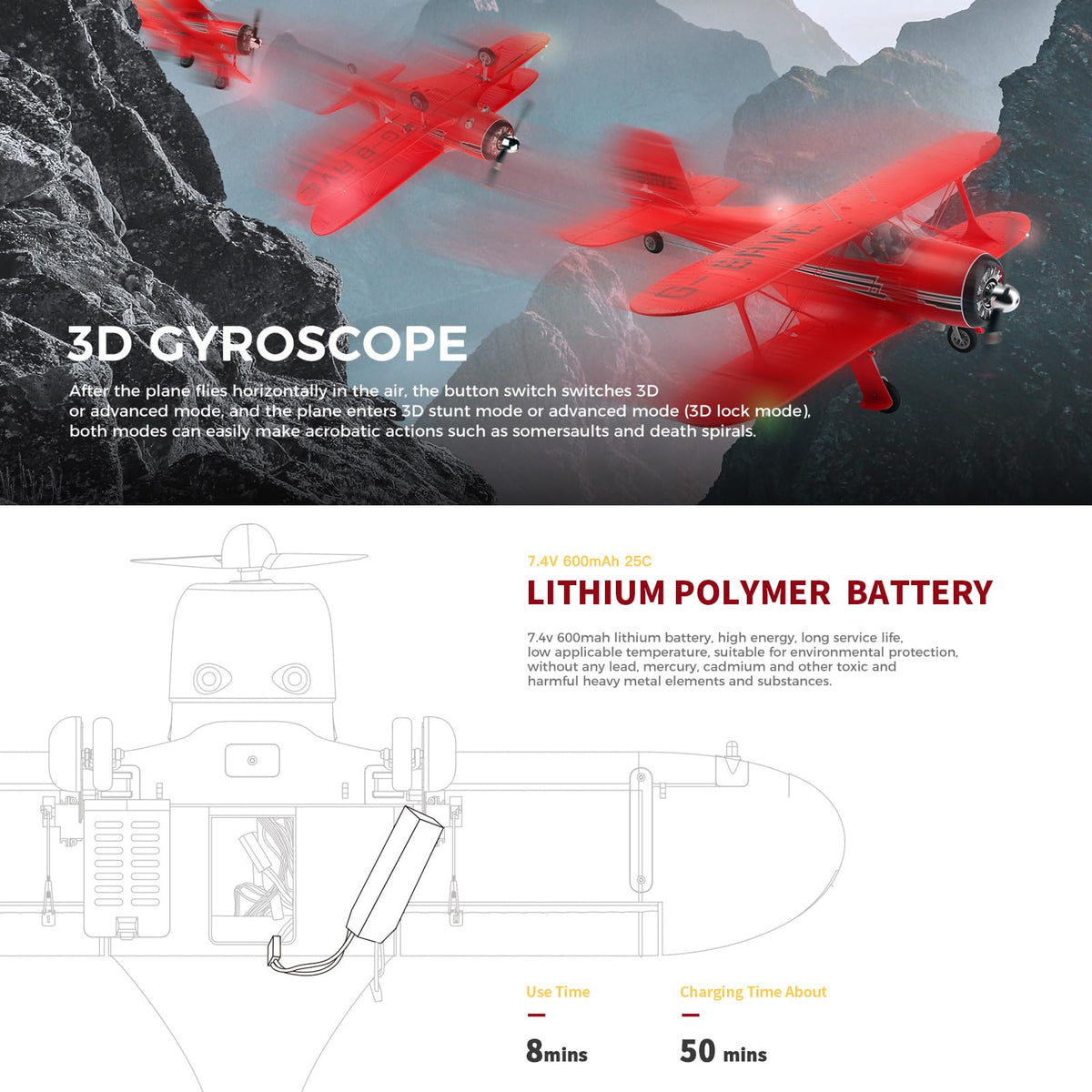 Features: Powerful Brushless Motor: Made of EPP engineering materials, 1806 strong magnetic brushless motor with ultra strong power. 2g high-precision digital servo, quick response and fast locking. The remote control adopts an independent potentiometer control, providing a more precise and comfortable handling experience. 3D/6G Mode Conversion: The aircraft adopts a 6-axis gyroscope, attitude locking, and 3D/6G mode conversion, suitable for flying in different scenarios. Air mode conversion, which combines beginner mode and stunt flight mode. The blades, motors, and wings can be disassembled for easy replacement. Multiple Flight Modes: outdoor 6G level flight mode, default to 6G self stable mode for takeoff, gyroscope self stable, heading locked, very suitable for beginners to practice flying in fixed wing mode. Outdoor stunt mode, After the aircraft flies horizontally in the air, the button switch switches to 3D or advanced mode, and the aircraft enters 3D stunt or advanced mode (3D locked mode). Both modes can easily perform stunt actions such as somersaults and death spirals. LED Lights and Rechargeable Battery: The body is equipped with LED lights to fly freely even at night, and the remote control can also control the lights with one click High capacity and high magnification 7.4V 600mAh 25C lithium polymer battery, with a glide flight time of about 8 minutes. Specifications: Item: Remote Control Airplane Material: EPP Frequency: 2.4GHz Motor: 1806 Brushless Motor Remote Control Distance: About 150m Charging Time: About 50min Flying Time: About 8min Airplane Battery: 7.4V 600mAh battery (Included) Remote Controller Battery: 6* AA battery (not Included) Size: 55*48.7*22cm Package List: 1* RC Airplane 1* Airplane Battery 1* Remote Controller 1* USB Charging Cable 1* Screwdriver 1* L Shape Wrench 1* Wrench