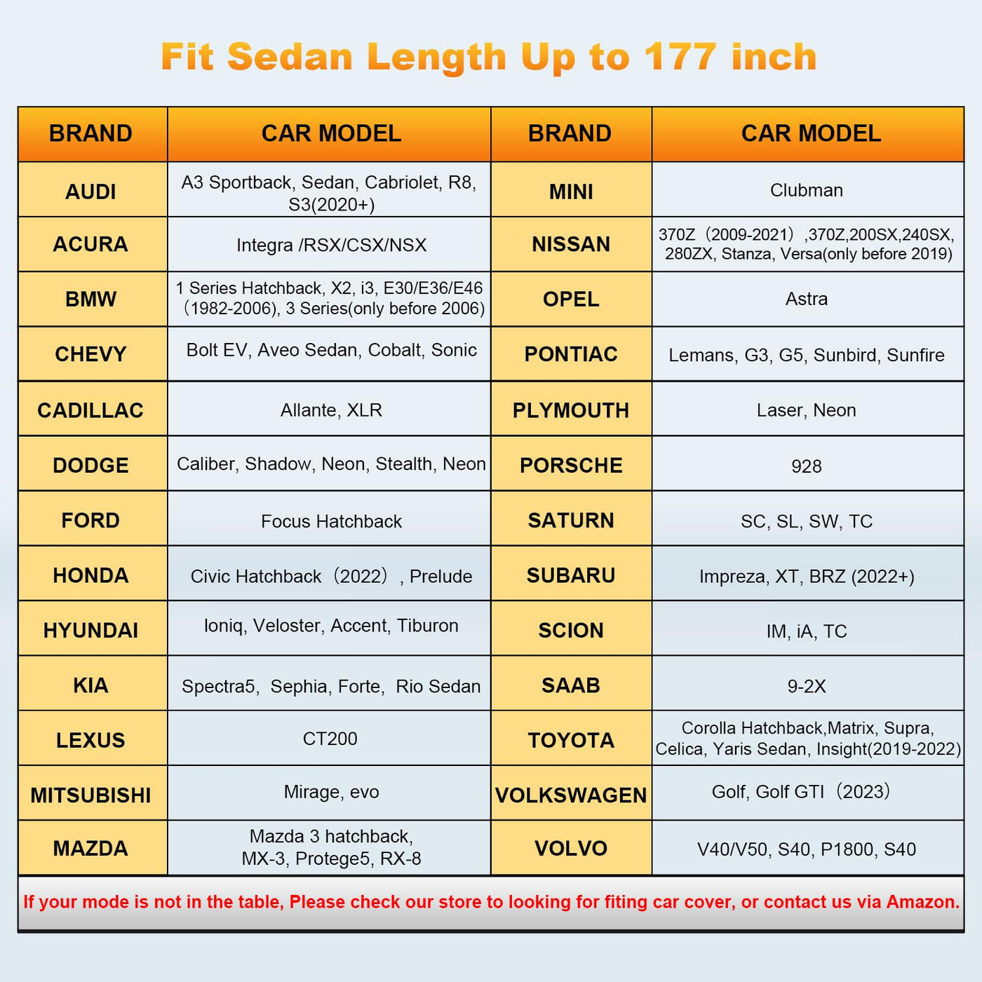 Color: Silver vHigh quality fabric:High density and durability polyester taffeta Material vSize:Fit Hatchback-Length(Up to 177 inch) vPackage Included: ?1 x Car Covers ?1 x Storage Bag ?1 x Warranty Card v24 Hours Service: Feel free to contact us via support@gordita.us if any issue.