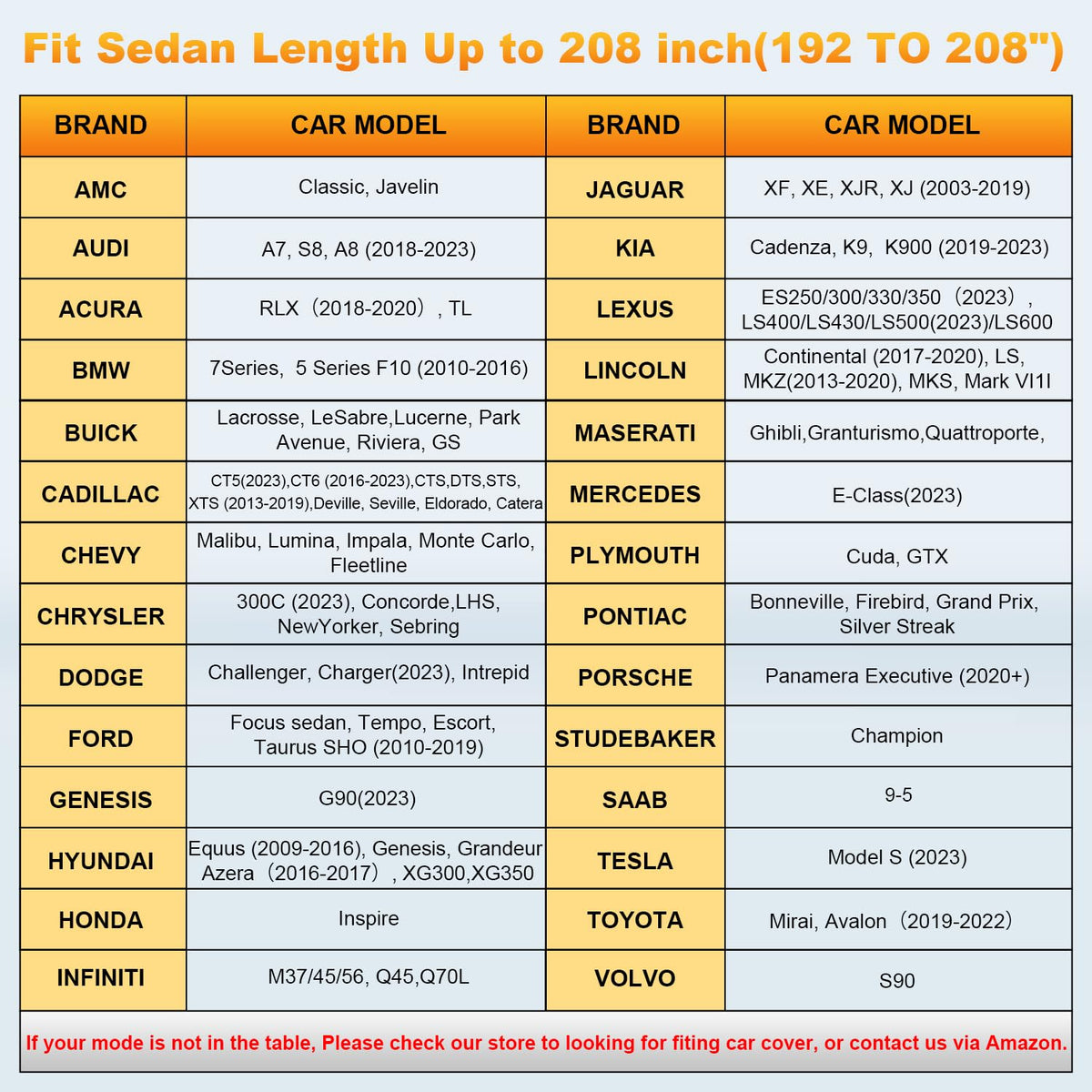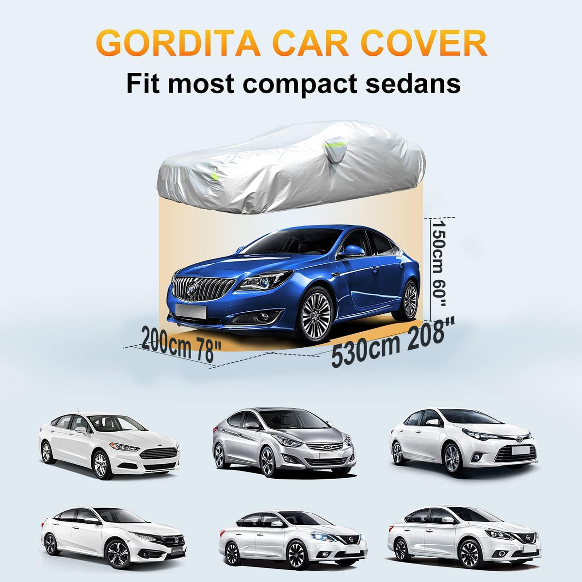 Color: Silver vHigh quality fabric:High density and durability polyester taffeta Material vSize:Fit Hatchback-Length(Up to 208 inch) vPackage Included: ?1 x Car Covers ?1 x Storage Bag ?1 x Warranty Card v24 Hours Service: Feel free to contact us via support@gordita.us if any issue.