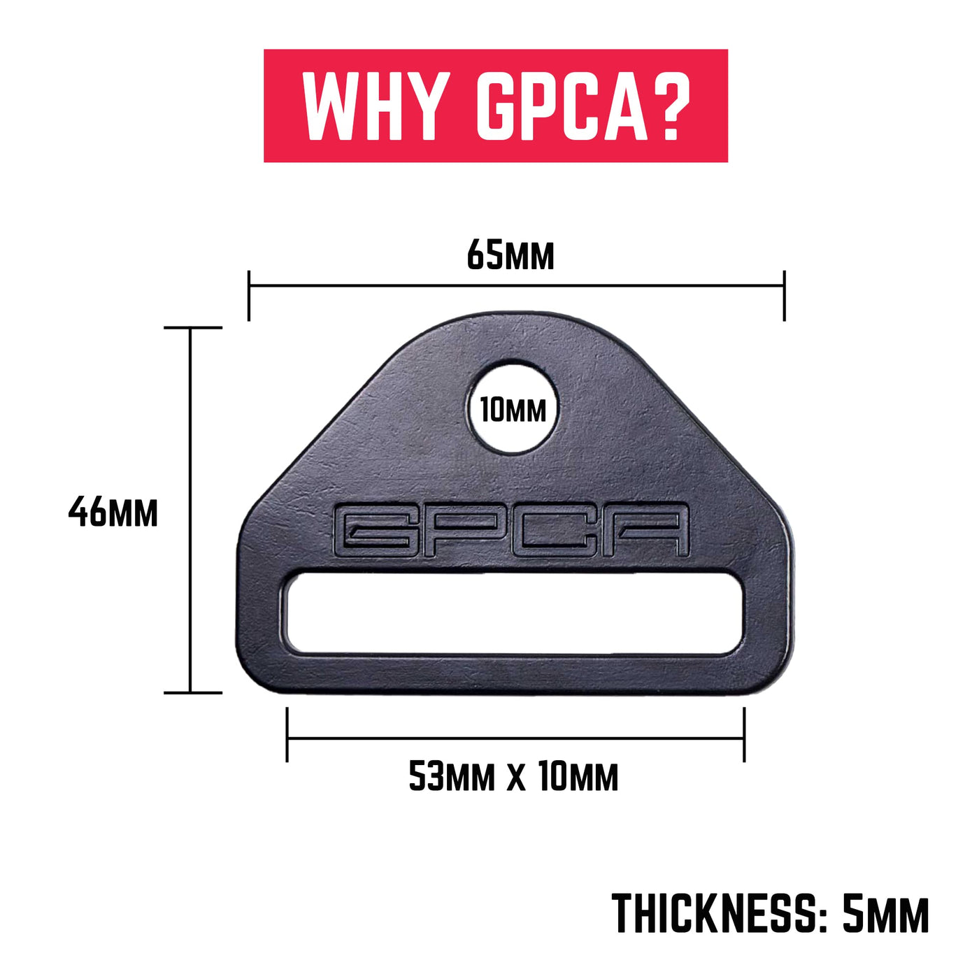 Q: What are the dimensions of the GPCA Tie Down D-Plates?A: The GPCA Tie Down D-Plates measure 2.75″ X 1.875″ X 0.125″ (68mm X 45mm X 3mm), with a slot dimension of 2.25″ X 0.375″ (55mm X 9mm) and a mounting hole diameter of 0.4375″ (10mm).