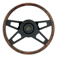 Q: What type of materials is the Grant 404 Challenger made from?A: The Grant 404 Challenger Steering Wheel is crafted from high-quality wood with a genuine hardwood walnut finish, complemented by matte black steel spokes for durability and style.