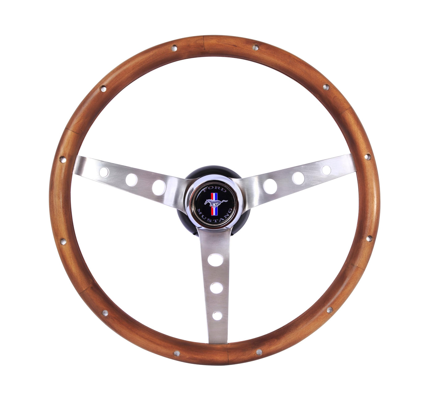 Q: What materials are used in the Grant 963 Mustang Steering Wheel?A: This steering wheel features a genuine hardwood walnut finish with finger grips and brushed stainless steel spokes, combining durability with a classic look.