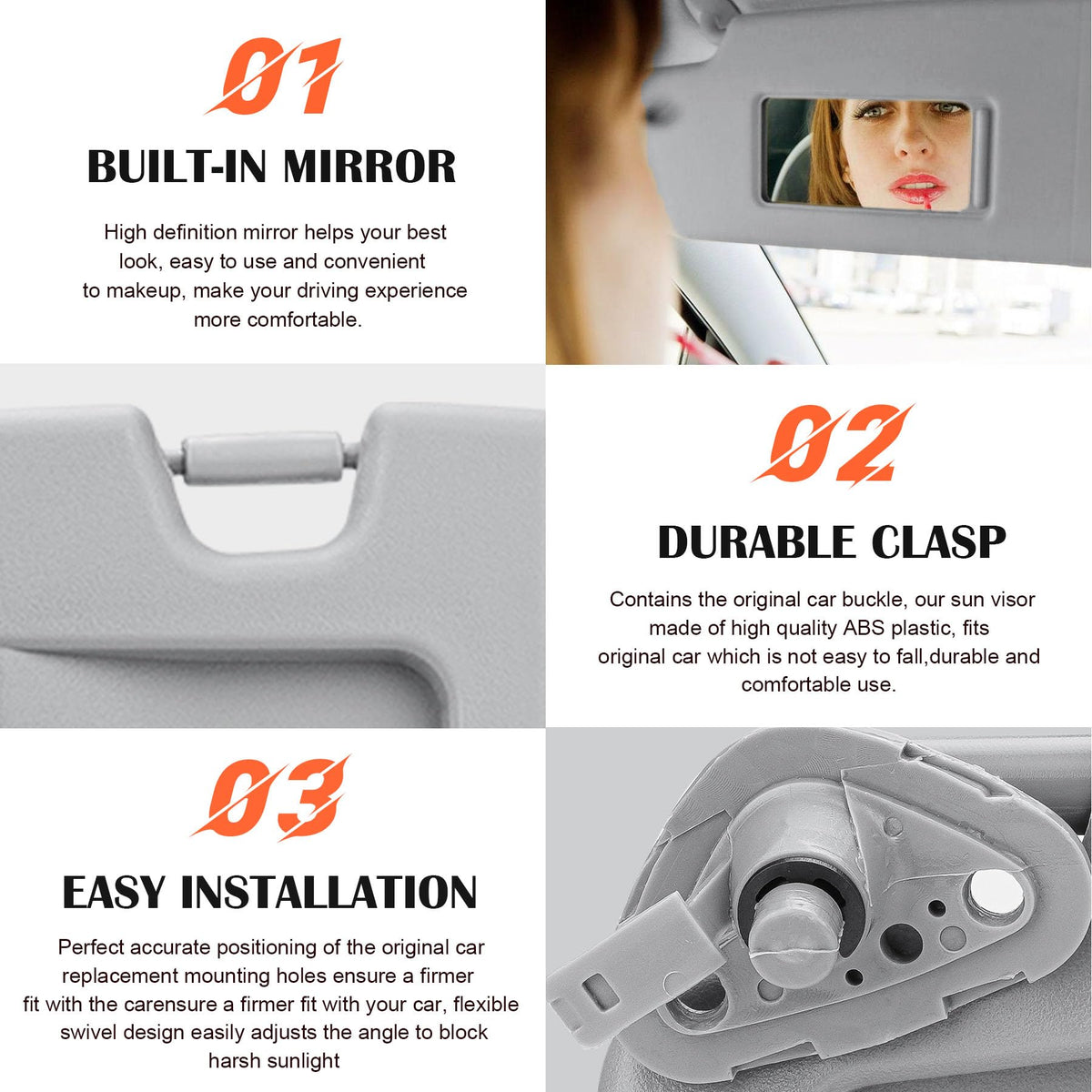 Gray Passenger Right Side Sun Visor Replacement Compatible with 2006-2011 Honda Civic EX LX Sedan SI Coupe Replace 83280-SNA-A01ZA Specification: Fitment: 2006 Honda Civic EX LX Sedan SI Coupe 2007 Honda Civic EX LX Sedan SI Coupe 2008 Honda Civic EX LX Sedan SI Coupe 2009 Honda Civic EX LX Sedan SI Coupe 2010 Honda Civic EX LX Sedan SI Coupe 2011 Honda Civic EX LX Sedan SI Coupe Replace Part Number: 83230-SNA-A01ZA Features: Material: ABS & Stretch cotton Color: Gray Type: Built-in Mirror Position: Right Passenger Side