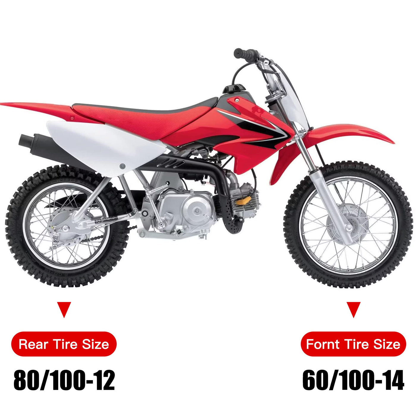 Grehua 3.00-12 80/100-12 And 2.50-14 60/100-14 Heavy Duty Rear Front Tire Tube Fit For 90-125Cc Dirt Bikes, Trail Bikes, Pit Bikes,Scooters And Mopedsoff-Road Motocross,Such As:Thumpstar, Atomik, ,Apollo,Kayo,Stomp Demon X, Wpb, Orion, M2R, Lucky Mx, Explorer, Braaap, Pitster Pro, Ssr,Dhz, Tdr,Ycf,Imr,Bse,Gpx, Sdg,Piranha,Lifan,Yx. Front Tire 60/100-14 (2.50-14) Fit 14'' Rim,Inner Tube Fit 14''Dirt Bike Tires Wheel Hub And 2.50'' Wide Tire.Rear 80/100-12(3.00-12) Fit 12'' Rim And 12'' Dirt Bike Tires Wheel Hub ,Fit 3.0'' Wide Tire. Feature: 1.We Have A Free Inner Tube Repair Kit,When You Have Any Kind Of Problem With Your Tires Inner Tube,You Can Use It For Repairs Anytime, Anywhere. 2.Our Red Stem Valve Caps Made Of Aluminum,Sturdy And Durable,Rustless. 3.Our Inner Tube Made Of High Quality Rubber And Tire Made Of Thick Rubber Blend,Have A Superior Impact And Vibration Dampening Property, It'S Puncture Resistant And Explosion-Proof. 4.The Consequences Of Not Replacing Inner Tube And Tire For A Long Time Are: When Inner Tube Is Frequent Air Leaks And Cracks, The Tire Cracks Or Textures Disappear,Used For A Long Time, Tire After Aging,It Is Easy To Cause Safety Problems.For Your Safety, Please Replace Inner Tubeand Tire Immediately Fitment: Crf70 Crf70F Crf110 Cr60R Xr70 Xr70R Klx110 Klx110L Kx60 Kx65 Kx110 Jr80 Ds80 Rm60 Rm65 Ttr90 Ttr90E Ttr110E Yz50 Yz60 Yz65 Pw80 Baja Motorsports Dr70 Taotao Db14 Cx65 Tc65 65Sx 65Xc Package Included: 2 X Tire 2 X Inner Tube 2 X Red Stem Valve Metal Caps 2 X Black Stem Valve Caps 1 X Metal Cleaning Rasp 6 X Self-Adhesive Round Patches Note: —We Provide Clear Pictures, Measurements Where Possible.Please Check As Much As Possible To The Item Size Carefully Before Purchasing.