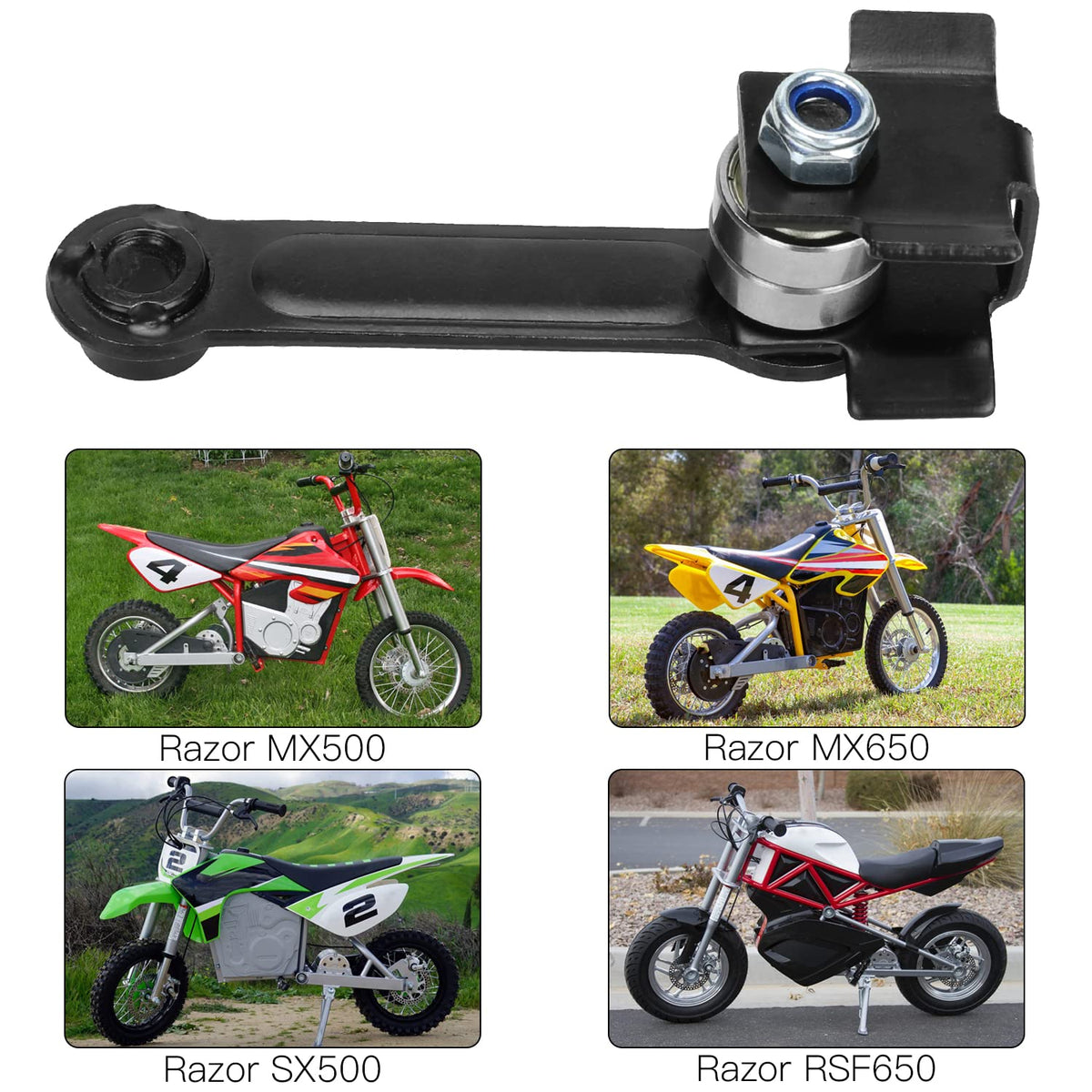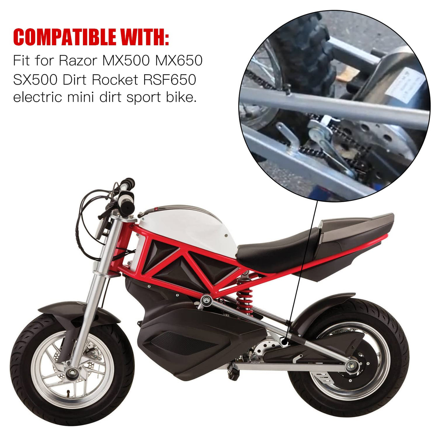 Chain Adjuster Tensioner for Razor MX500 MX650 SX500 Dirt Rocket Electric Motocross Bike RSF650 Electric Mini Dirt Sport Street Bike. Fit for all versions of Razor MX500 MX650 SX500 Dirt Rocket RSF650 Electric Mini Dirt Sport Bike. Feature: 1.Long-term use without inspection and adjustment will cause the chain to become loose,so need to check and replace your chain adjuster regularly to ensure driving safety. 2.Chain Adjuster Tensioner easy to adjust, install and disassemble.No modification is required, just take off your broken or old tensioner and install the new replacement. 3.We have complete accessories in each package. Fitment: 1.Versions of Razor MX500 MX650 SX500 Dirt Rocket. 2.Razor RSF650 Electric Mini Dirt Sport Bike. Package Included: 1 x Chain Tensioner 1 x Spring 1 x Nut -Please check as much as possible to the item picture, model and size carefully before purchasing.