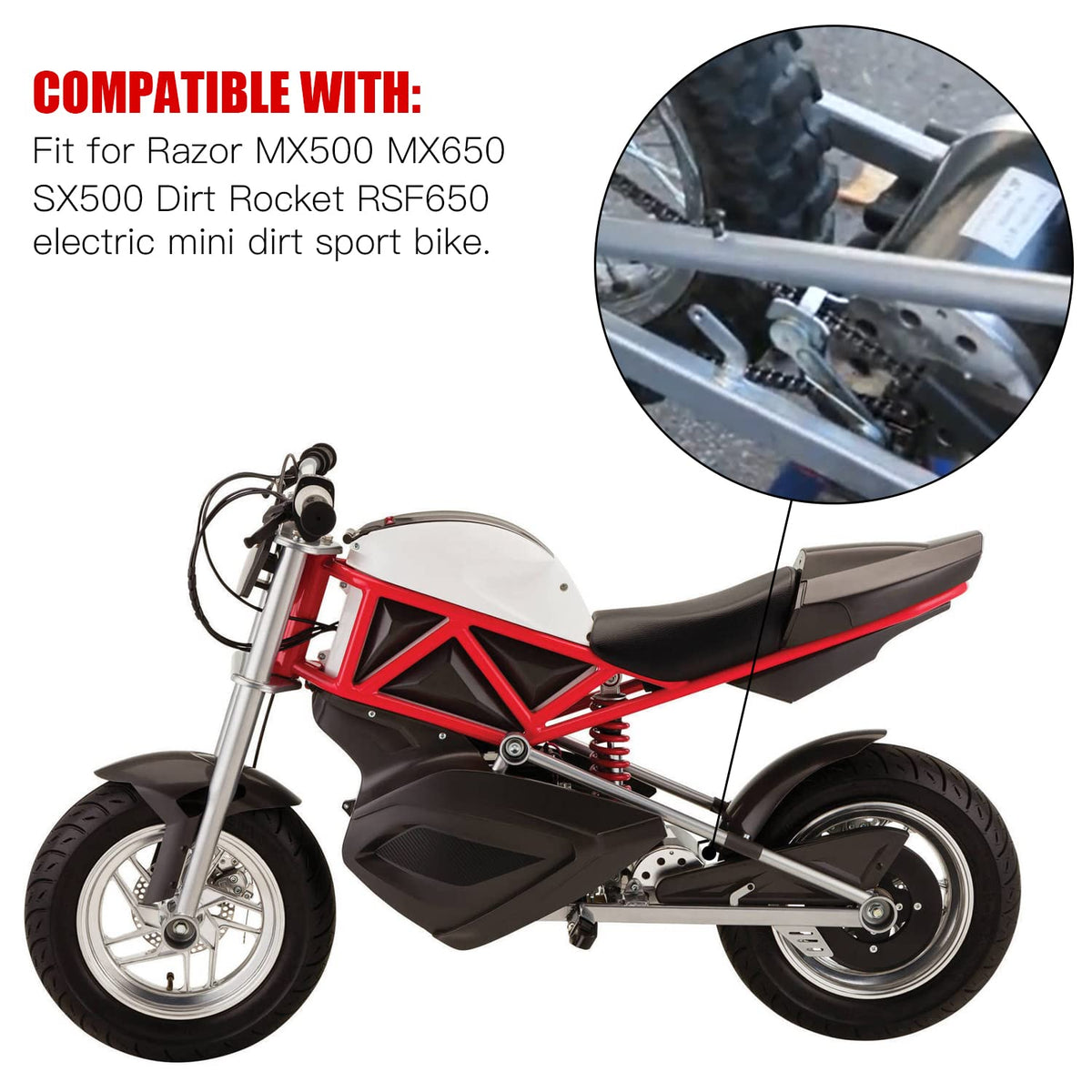 Chain Adjuster Tensioner For Razor Mx500 Mx650 Sx500 Dirt Rocket Electric Motocross Bike Rsf650 Electric Mini Dirt Sport Street Bike. Fit For All Versions Of Razor Mx500 Mx650 Sx500 Dirt Rocket Rsf650 Electric Mini Dirt Sport Bike. Feature: 1.Long-Term Use Without Inspection And Adjustment Will Cause The Chain To Become Loose,So Need To Check And Replace Your Chain Adjuster Regularly To Ensure Driving Safety. 2.Chain Adjuster Tensioner Easy To Adjust, Install And Disassemble.No Modification Is Required, Just Take Off Your Broken Or Old Tensioner And Install The New Replacement. 3.We Have Complete Accessories In Each Package. Fitment: 1.Versions Of Razor Mx500 Mx650 Sx500 Dirt Rocket. 2.Razor Rsf650 Electric Mini Dirt Sport Bike. Package Included: 1 X Chain Tensioner 1 X Spring 1 X Nut —Please Check As Much As Possible To The Item Picture, Model And Size Carefully Before Purchasing.