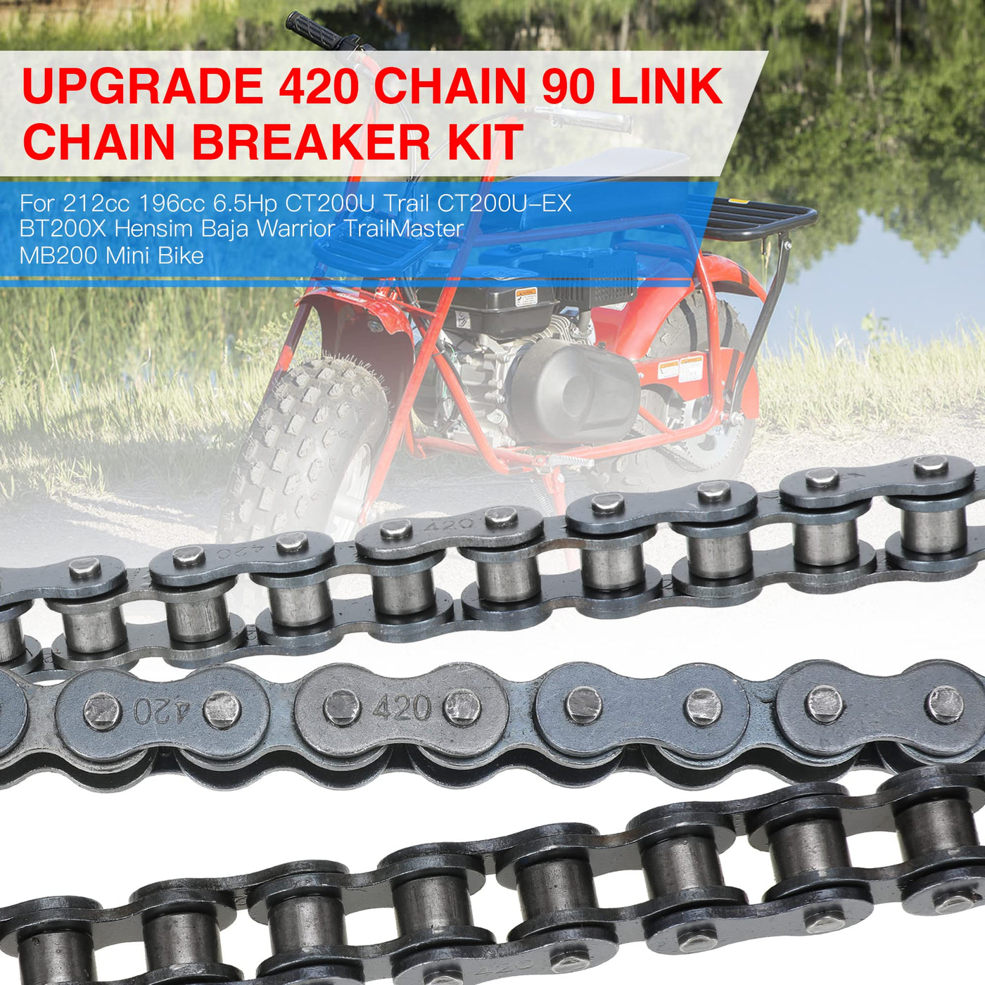 GREHUA CT200U 420 Chain 90 Link Chain Breaker with Master Link Fit for 212cc 196cc 6.5Hp Coleman Powersports CT200U Trail 200 CT200U-EX BT200X Hensim Baja Heat Warrior MB165 MB200 TrailMaster MB200 mini bike parts Motorsports. Feature: 1.High Quality and Easy To Install-the 420 90Link Heavy Duty Drive Chain is made of high quality metal material reliable transmission,heavy duty capacity,and high strength for a long time use.It is easy to install and operate,andaffordable replacement. 2.High Performance and Reasonable Design-the 90-link 420 chain for the mini bikes is the longer of these bikes' two chains.And andpre-stretched for better performance with fewer adjustments.The high quality 420 chain 90link assures long engine life and the most efficient performance.And 420 master link can be used to adjust the length of the chain,according to the condition of your mini bike. 3.We have complete accessories in each package. Fitment: Fitment modle Compatibility: Coleman Powersports CT200U,BT200X,CT200U-EX,CT200U-EXR,CT200U Trail 200 Baja Motorsports Mini Bike MB165 & MB200 (Heat, Mini Baja, Warrior) Hensim Mini Bike MB165 & MB200 (Heat, Mini Baja, Warrior) Massimo MB200 TrailMaster MB200 Item Condition:New Material:Metal Package Included: 1 x 420 Jackshaft Chain 90 Link 10 x Master Link 1 x Chain Breaker Note: We provide clear pictures, measurements where possible.Please check as much as possible to the item picture, model and size carefully before purchasing.