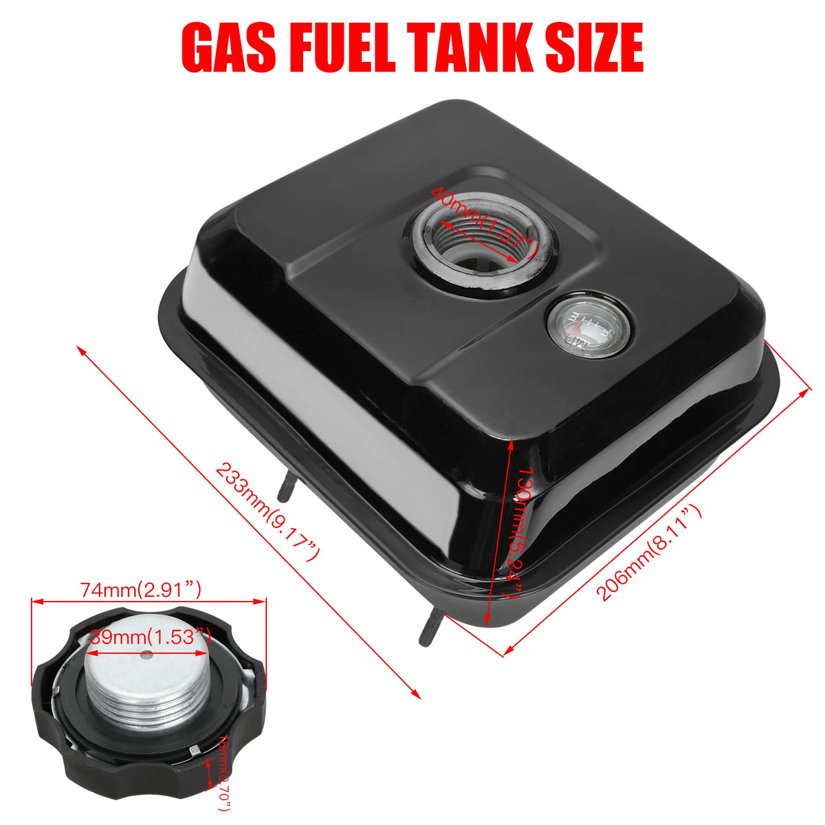 GREHUA Predator 212cc Upgrade Gas Fuel Tank with Fuel Level GaugeFit for go kart engine mini bike generator powered by non hemi predator 212cc 196cc 6.5hp performance parts powerhorse GX160 GX200 Hammerhead 80T Baja Warrior MB165 MB200 Coleman CT200U BT200X KT196.Feature:1.High Performance-upgrade threaded design of fuel tank cap to prevent fuel tank leakage,it is more easier to install.In addition, with the amount of fuel gauge, you can observe the amount of fuel in the tank at any time. And you can add fuel in time to prevent no fuel when riding. 2.We have complete accessories in each package.Fitment:Fitment Modle Compatibility :Predator 212cc 6.5hp,Non Hemi 212ccColeman CT200U Trail 200 ,BT200X ,CT200U-EX,CT200U-EXR,KT196,RB200Massimo MB200Baja Mini Bike MB165 & MB200 (Baja Heat, Mini Baja, Baja Warrior).Hensim Mini Bike MB165 & MB200 (Heat, Mini Baja, Warrior)Falcon 200 Mini BikeMASSIMO MB200Motovox MBX20Manco Go Kart Hammerhead 80T Go KartHammerhead Mini Shark Go KartTrailMaster Buggy Interceptor Go Kart TrailMaster MB200-1,MB200-2Item Condition : NewColor : BlackMaterial:MetalFuel Tank Capacity:3L/0.8 gallonsProduct Size:Length of Fuel Tank:233mm/9.17 Width of Fuel Tank:206mm/8.11 Height of Fuel Tank:130mm/5.24 Package Included:1 x Fuel tank1 x Tank Cap1 x Spark Plug1 x Screw,2 x Clip,2 x Nut1 x Wrench,1 x Collar1x In-Tank Filter1 x Valve petcock1x Fuel line Tube-Please check as much as possible to the item picture, model and size carefully before purchasing.