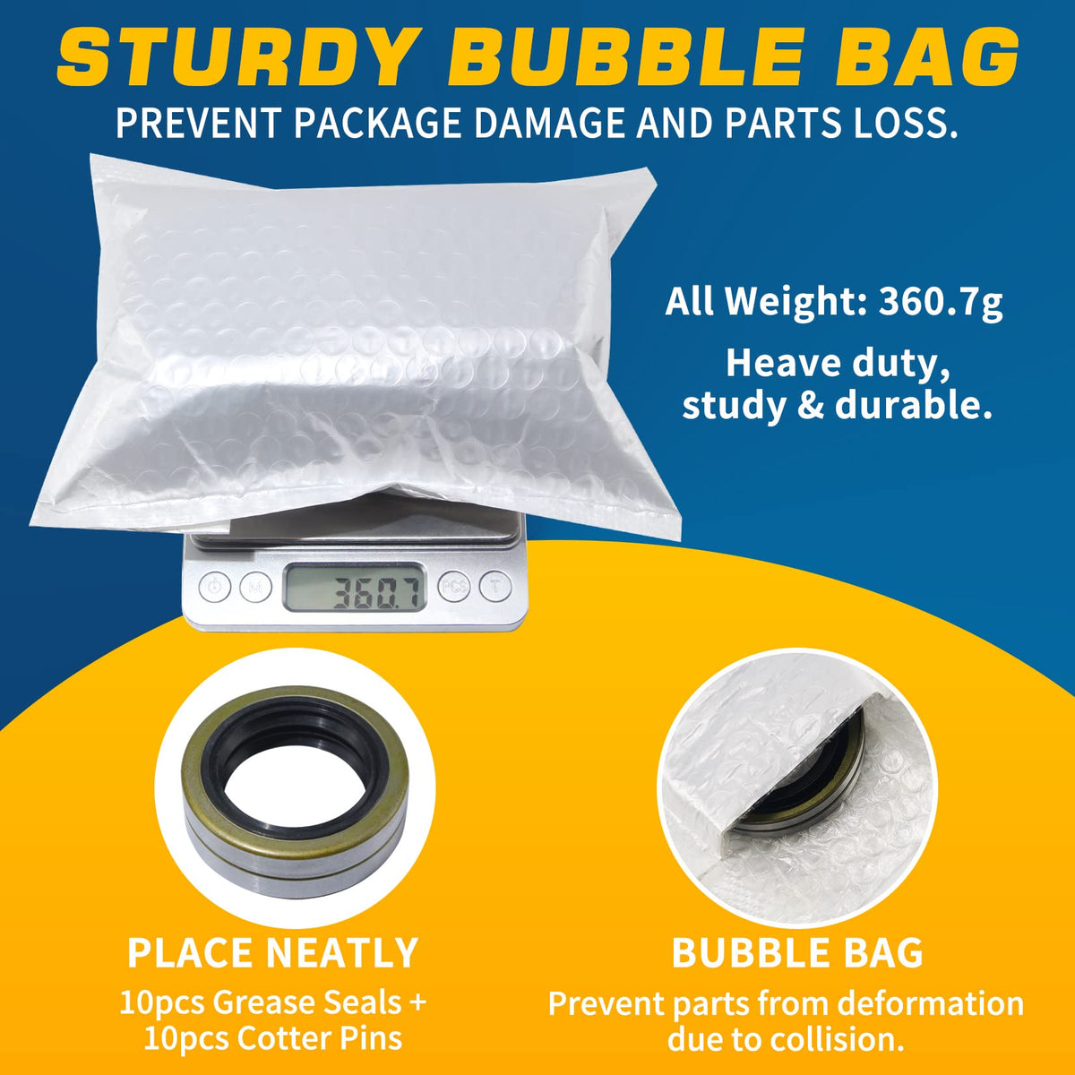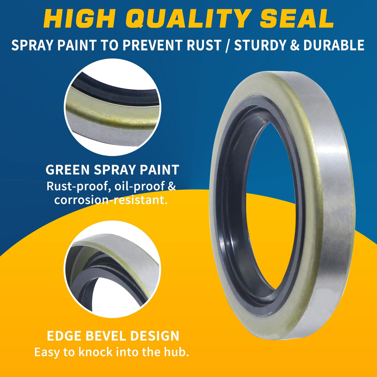 Function: Wheel oil seals prevent dirt, debris and outdoor elements from intruding into the axle hubs of your RV and trailer, and limit lubricant leakage. Description: Fits 3,500 lbs Axles, Most 5 Lug Hubs, EZ-Lube Axles and #84 Spindles and regular axle hubs/drums. Compatible with Dexter, ALKO AXIS, QUALITY, AXLETEK and other brand 3500lbs Trailer Axles. As an exact-match part, this kit installs just like your original equipment, and is made to enhance your trailer's axle system. Oil Seal Dimensions: I.D.: 1.719'' O.D.: 2.565'' Width: 0.5'' Cross Reference Part Numbers: Cross Ref.# 10-19/171255TB For Dexter Numbers: 010-019-00 (10-19) For Transcom Numbers: 171255TB For National Numbers: 473336 For NOK Numbers: AD2548EO Package Includes: 10pcs Trailer Hub Grease Seals 10pcs Cotter Pins