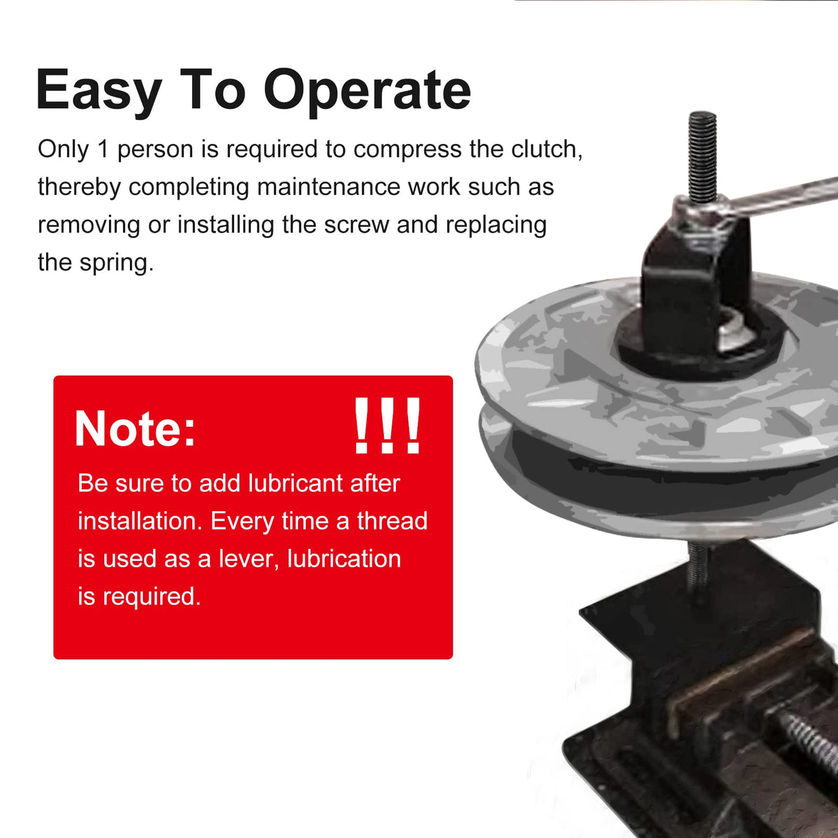Q: What maintenance is recommended for the GSTP Clutch Compression Tool?A: Regularly check the tool for wear and tear. After each use, clean it and apply lubricant to the threads to ensure smooth operation and prevent rust, especially since lubrication is crucial every time the tool is used as a lever.