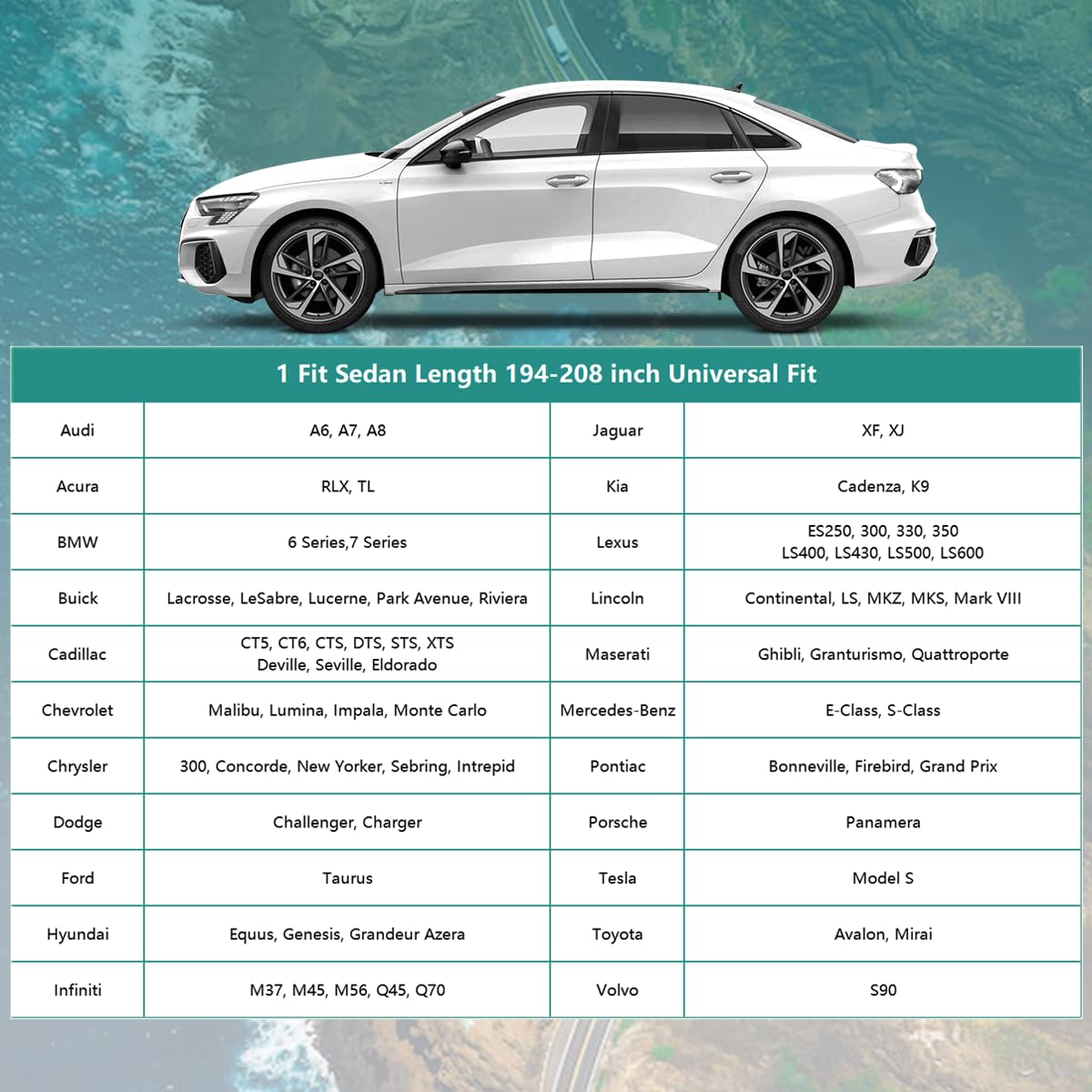 ?Premium Material?GUNHYI full exterior cover is suitable for use in all seasons. 1- Made of high-quality material vinyl, better waterproof, more wear-resistant and tear-resistant. 2- It has good sunproof and anti-ultraviolet effect, the vehicle can keep cool in hot weather. 3- The inner lining is upgraded soft cotton that would protect vehicle paint better. ?All Weather Protection?GUNHYI heavy duty car cover suitable for indoor and outdoor use, can effectively protect your vehicle from sun, uv-rays, dust, snow, fallen leaves, industrial pollution, bird droppings, pollen, animals, acid rain and extreme weather. ?Unique Design?1- Breathable vents effectively prevent moisture accumulation and keep dry. 2- Thickened material, Mirror pockets, Three windproof straps at front, middle and rear, which can prevent the car cover from being blown away in strong winds. 3- Driver door zipper design for easy access. 4- Comes with a microfiber towel that you can use to clean your car, because if there is sand on the surface of the car before use, it may damage the paint. ?Model Choice?GUNHYI automobiles cover is suitable for Sedan, Length 194 to 208 inch (Not for SUV Hatchback). For exmaple--Lexus ES350, Tesla Model S, Toyota Avalon, Hyundai Genesis, Jaguar XJ/XF, Lincoln MKZ, Dodge Charger, Chrysler 300, Ford Taurus, Buick Lacrosse/Lesabre, Cadillac Deville/Seville, Mercedes Benz S-Class etc. ?What You Get?1pcs GUNHYI Premium Car Cover, 1pcs Microfiber Towel, 1pcs Storage Bag and 12 Months Warranty. We are committed to our products and services, if you have any questions during use, please feel free to contact us and we will provide you with a satisfactory solution!