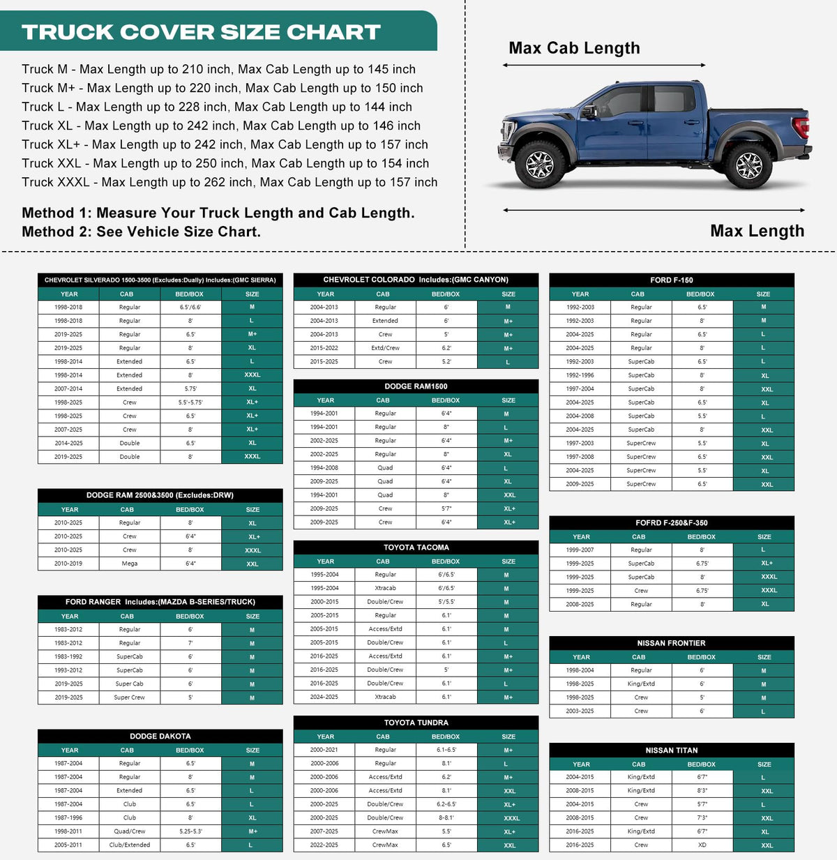 ?Premium Material?GUNHYI full exterior cover is suitable for use in all seasons. 1- Made of high-quality material vinyl, better waterproof, more wear-resistant and tear-resistant. 2- It has good sunproof and anti-ultraviolet effect, the vehicle can keep cool in hot weather. 3- The inner lining is upgraded soft cotton that would protect vehicle paint better. | ?All Weather Protection?GUNHYI heavy duty truck cover suitable for indoor and outdoor use, can effectively protect your vehicle from sun, uv-rays, dust, snow, fallen leaves, industrial pollution, bird droppings, pollen, animals, acid rain and extreme weather. | ?Unique Design?1- Breathable vents effectively prevent moisture accumulation and keep dry. 2- Thickened material, Three windproof straps at front, middle and rear, which can prevent the truck cover from being blown away in strong winds. 3- Comes with a microfiber towel that you can use to clean your truck, because if there is sand on the surface of the truck before use, it may damage the paint. | ?How to choose right size?Truck XL+ - Max Length up to 242 inch, Max Cab Length up to 157 inch. Please confirm truck length and cab size at the same time before your purchase. If you are not sure, please tell us your truck model (Year + Model + Cab), we will help you to confirm the right size thanks. | ?What You Get?1pcs GUNHYI Premium Truck Cover, 1pcs Microfiber Towel, 1pcs Storage Bag and 12 Months of Product Support. We are committed to our products and services, if you have any questions during use, please feel free to contact us and we will provide you with a satisfactory solution!