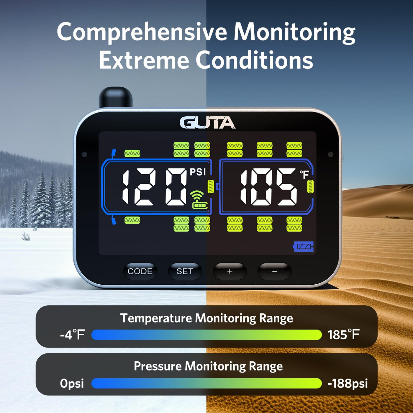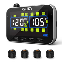The GUTA TPMS accurately monitors tire pressure from 0 to 188 PSI, making it essential for maintaining tire health, particularly for commercial fleets managing multiple vehicles. Its long-range connectivity ensures consistent monitoring for RVs, motorhomes, trailers, large trucks, and semi-trucks, crucial for safe cross-country travels. Offering six alert types, including rapid deflation and extreme pressure or temperature variations, it provides proactive safety for commuters and travelers alike. Available in models starting with four sensors and expandable up to 24 tires, the GUTA TPMS is ideal for personal travel, larger recreational vehicles, and commercial truck fleets. Users can customize parameters with options to switch pressure units between PSI and BAR and temperature units between ? and ?. Pre-labeled and factory-paired sensors allow immediate monitoring upon installation, and the system automatically sets the current pressure as the reference point for easy alarm threshold setup. The display orientation is adjustable for clear visibility, featuring a large color LCD screen with adjustable backlight settings and a rechargeable lithium battery lasting up to 15 hours on a full charge. To conserve battery, the monitor enters power-saving mode if no motion or vibration is detected for 15 minutes.