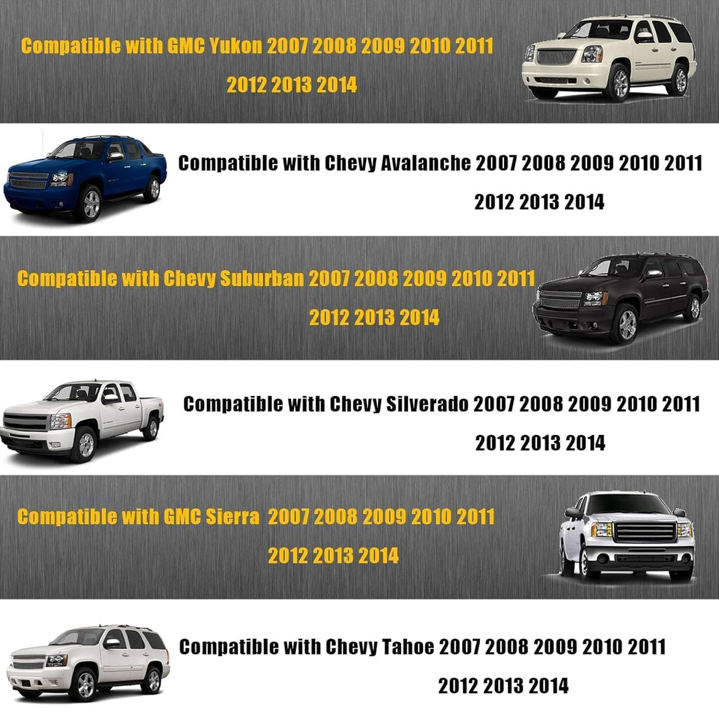 Q: What vehicles are compatible with the GXARTS leather seat covers?A: The GXARTS Driver and Passenger Side Bottom Replacement Leather Seat Covers are compatible with Chevy Tahoe, Suburban, Avalanche, Silverado, GMC Sierra, and Yukon models from the years 2007 to 2014.