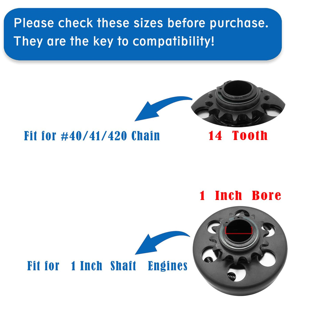 ?Specifications?: Clutch Bore: 1 inch Sprocket: 14 Tooth for #40/41/420 chain Clutch Dia: 107mm Clutch Height: 55mm Engagement Speed: 2300200 RPM Recommended Engine: Engines with Straight Shaft 2-8 HP ?Package Including?: 1 x 14 teeth centrifugal clutch 1 x accessories kits ?Tips?: The Centrifugal Clutch needs to be oiled before use. Before ordering please check your crankshaft size.