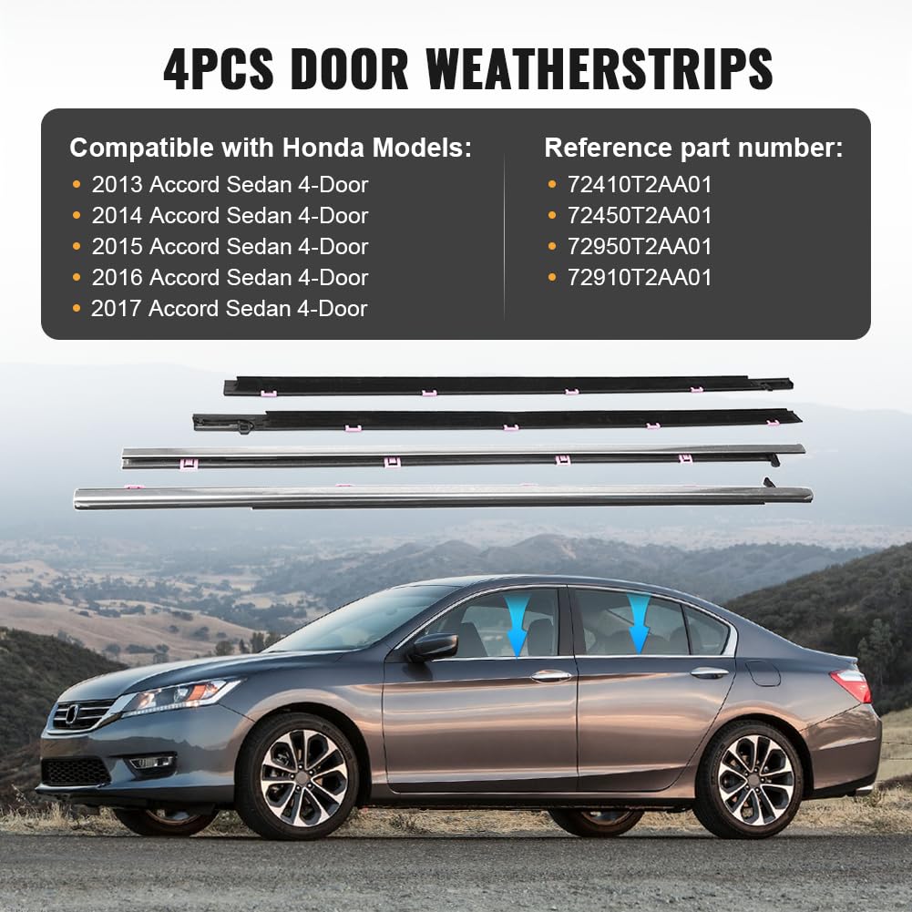 FL FR RL RR Chrome Outside Window Moulding Trims Weather-strips For Accord 13-17Features:- Soundproof,windproof,dustproof,weatherproof and resistance.- High tolerance,can be warped without distortion,durable and flexible.- High density felt,soft and no harm to your health.- Non- and environmental-friendly material.- Strong adhesive at the back,stick firmly.- Easy to install,just peel and stick.Fitment: for HONDA Accord 13-17(Please double check your vehicle model is exactly same as us .) Specifications:Condition: Brand NewFactory Part Number:72410T2AA01, 72450T2AA01, 72950T2AA01, 72910T2AA01Color: ChromePackage Included:4pcs Weatherstrips
