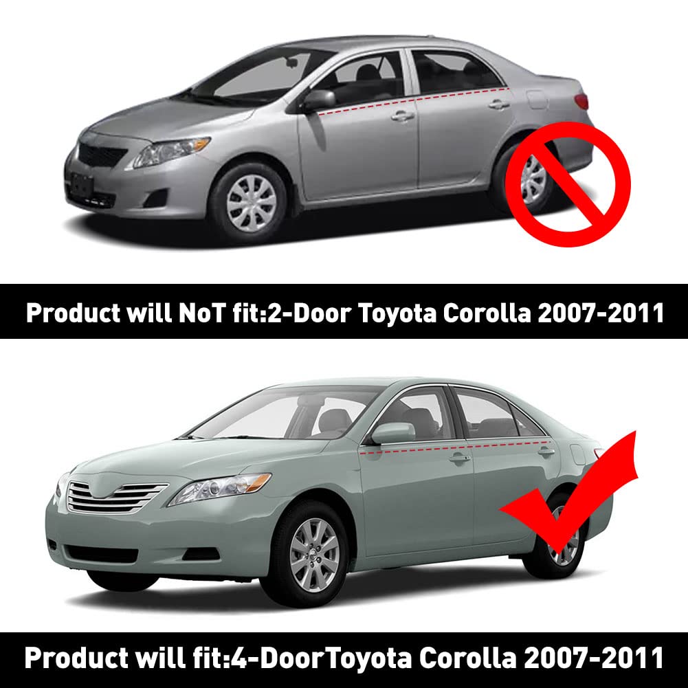 Door Belt moldinging Weatherstrip(Front&Rear Set) for Toyota Camry 4-Door 2007 2008 2009 2010 2011Features:- This is a must have for anyone looking for a inexpensive upgrade to their vehicle !- This is a top quality product that will give your vehicle more aggressive look!- UV-Coating protective surface make a stable performance under harsh UV-rays.- That is a really easy-to-install process,just take your time.Specifications:Condition: Brand newFitment:For for Toyota Camry 2007-2011 Manufacturer Part Number:75710-06080/75720-06080/75730-06060/75740-06060Color:ChromePackage included:4pcs/set Weatherstrips