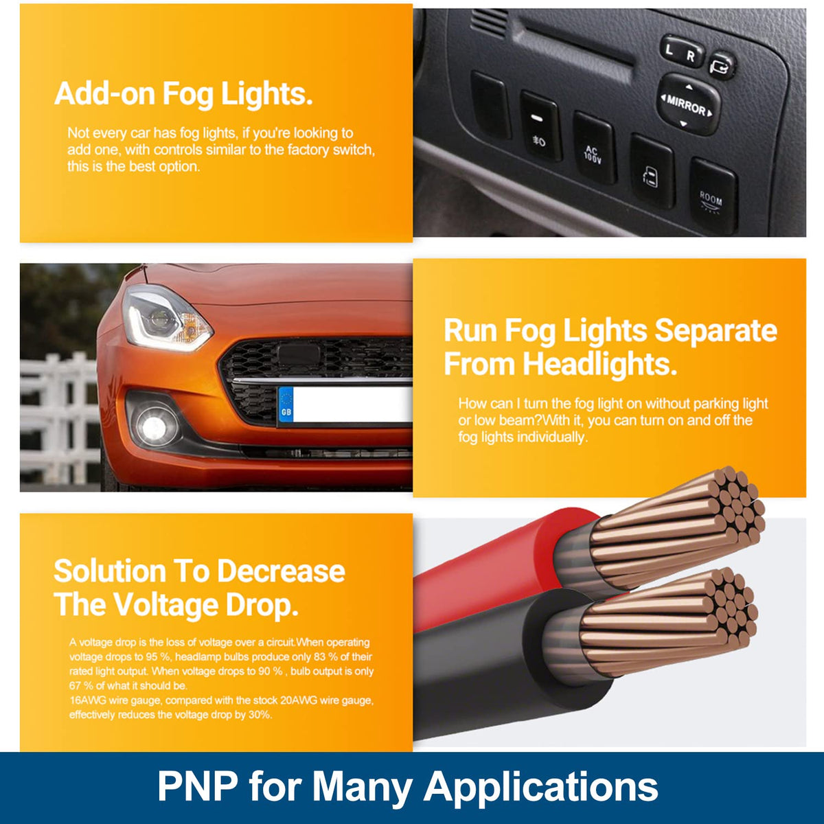 Q: How does the fog light wiring harness improve fog light performance?A: This wiring harness utilizes 16AWG wire, which reduces voltage drop by up to 30%, ensuring that your fog lights receive adequate power. This leads to brighter illumination, enhancing visibility in foggy or low-light conditions.