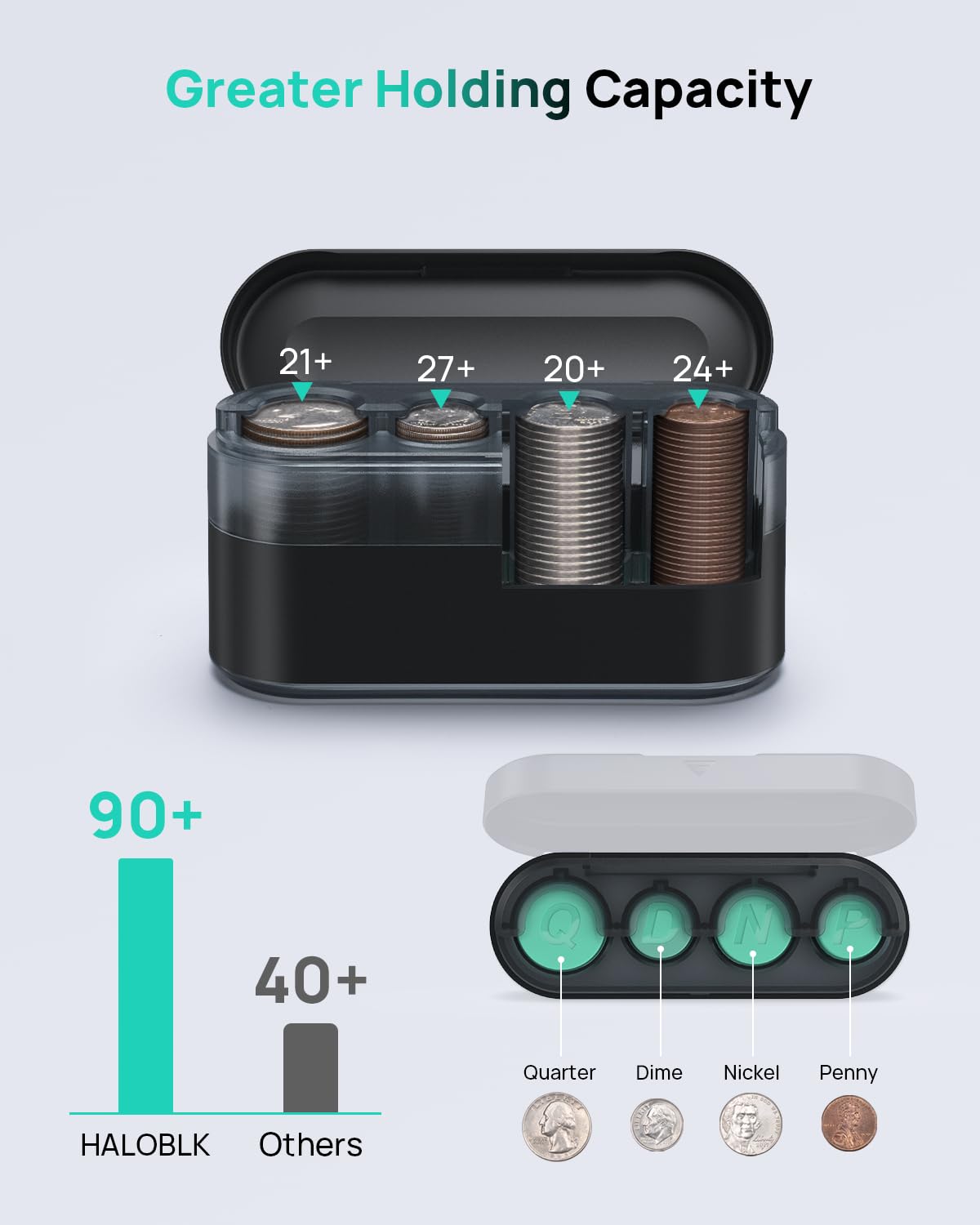 Q: What is the capacity of the HALOBLK coin holder?A: The HALOBLK coin holder has a larger capacity that can hold over 90 coins, including 21 quarters, 27 dimes, 20 nickels, and 24 pennies.