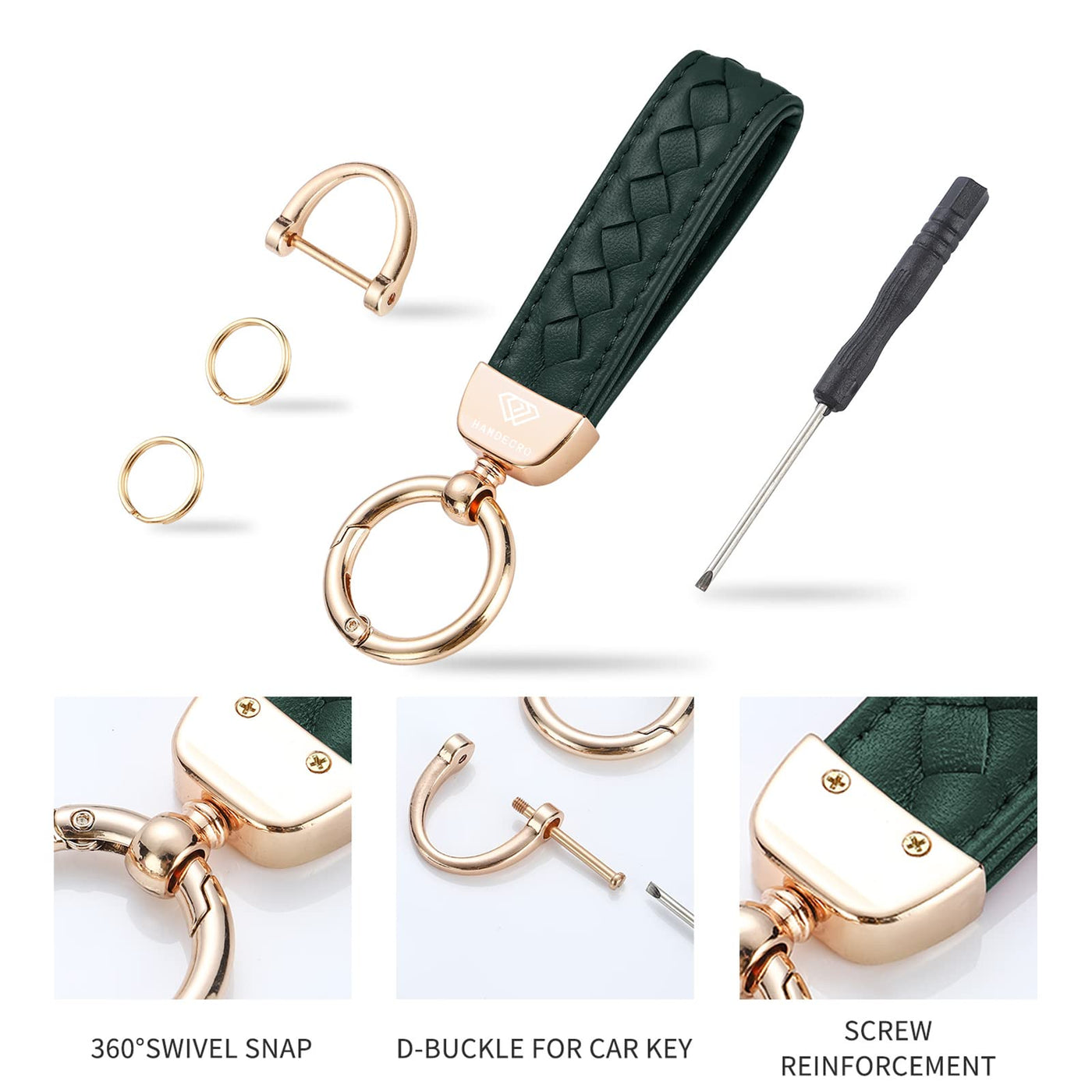 Hamdecro Genuine Leather Keychains, Handmade Knit Sheepskin Car Key Chains For Women, Universal Key Fob Holder With 360 Degree Rotatable, Anti-Lost D-Ring, 2 Keyrings And 1 Screwdriver - Green