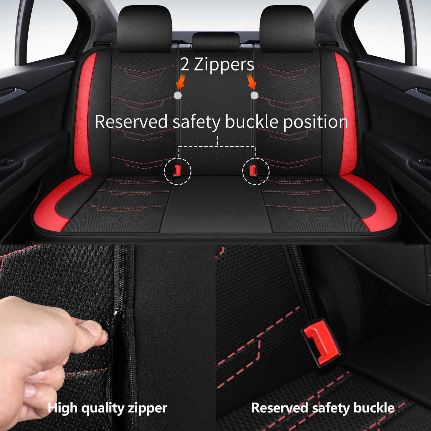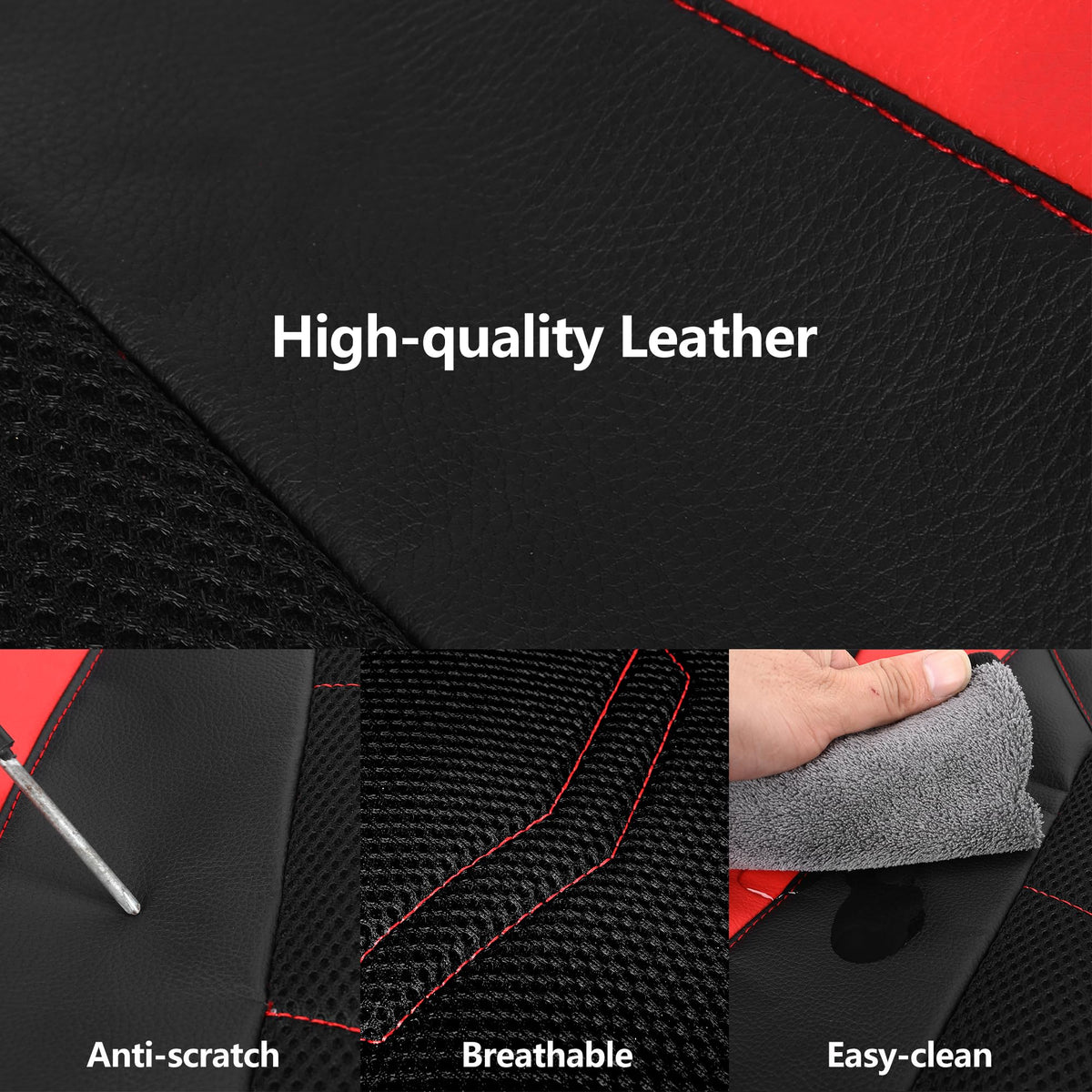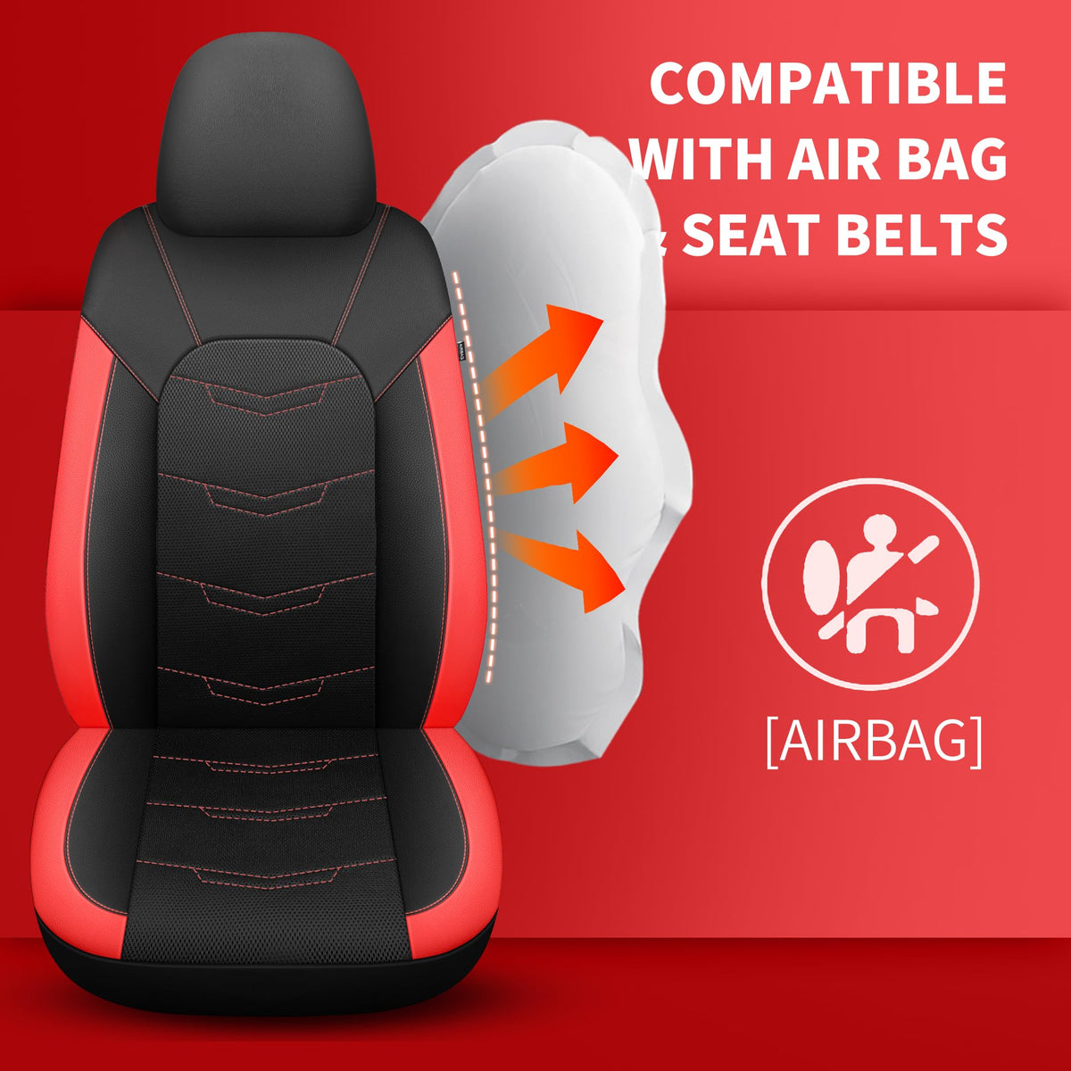 Universal Fit:Enhance your car's interior with our premium leather car seat covers, meticulously crafted for durability and style. Designed to fit most sedans, SUVs, vans, and trucks, they offer a luxurious feel and a distinctive look. Receive compliments with this 9-piece set: 2 front seat covers, 2 rear backrest cover, and 5 separate headrest covers, all in an easy-to-carry package. | Luxury Design:The luxury design of our car seat covers focuses on both comfort and functionality. We use breathable materials to enhance ventilation and incorporate perforations for a balance of sportiness and comfortable. The seat covers feature reinforced sections to improve support. Vibrant colors and dynamic lines not only boost the sporty look but also provide better coverage and protection. | Easy Installation:Installing our car seat covers is simple to do. Whether you're an experienced DIYer or new to car accessories, our comprehensive installation guides and videos make it easy to get started. If you have any questions, our responsive customer service team is ready to help. | Airbag Compatible:Our seat covers are airbag compatible, featuring reserved openings for headrest covers and seatbelts. Designed to fit most vehicles effortlessly, installation is quick and hassle-free. | Reliable Service:Installation is simple and requires no tools. We suggest watching our detailed installation video for help. Purchase with confidence, as you