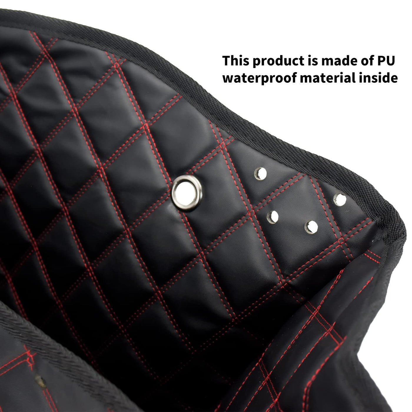 Q: What materials are the saddlebag liners made of?A: These saddlebag liners are made from waterproof soft PU synthetic leather, featuring a stylish red thread stitch pattern for added durability and aesthetic appeal.