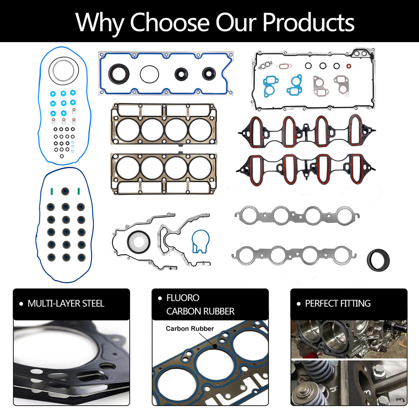 Q: What is included in the head gasket kit?A: The head gasket kit includes multi-layered steel (MLS) head gaskets, intake manifold gaskets, exhaust manifold gaskets, valve cover gaskets, viton valve stem seals, O-rings, other small gaskets and seals, a timing cover gasket, and an engine oil pan gasket set.