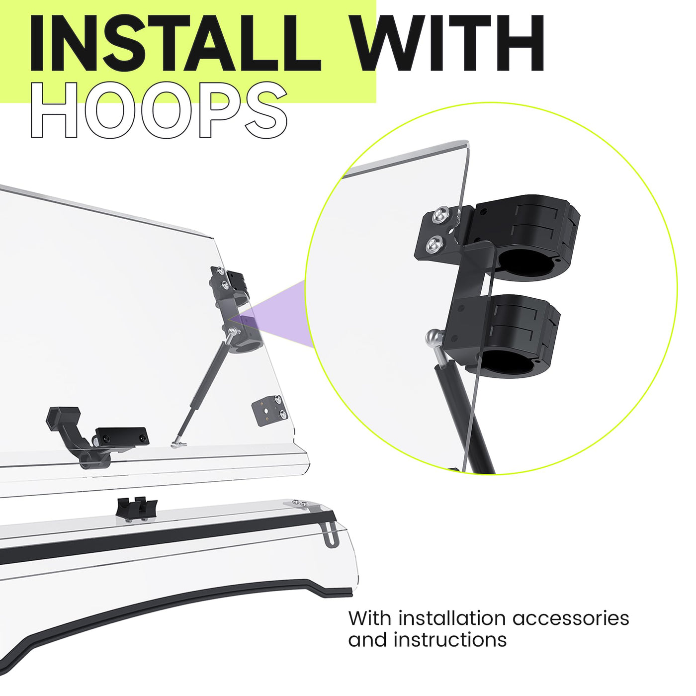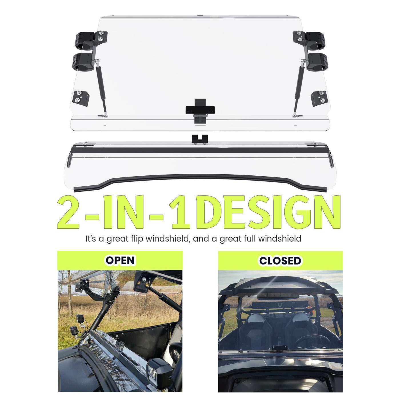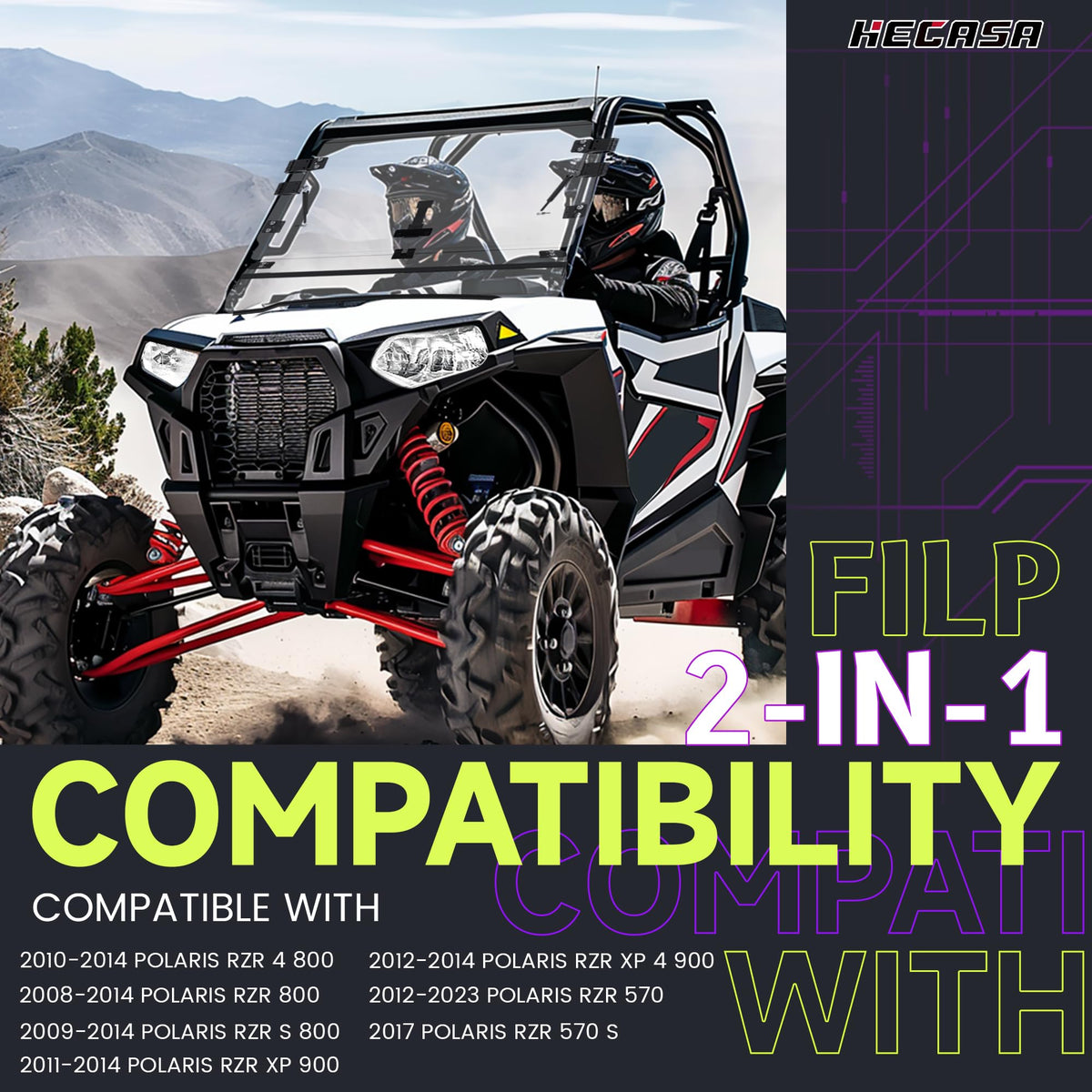 HECASA 2-IN-1 Full Clear Windshield Compatible with 2011-2014 Polaris RZR XP 900/ XP 4 900 Gas Spring Flip Fitment Compatible with 2011-2014 Polaris RZR XP 900, 2012-2023 Polaris RZR 570, 2017 Polaris RZR 570 S Compatible with 2012-2014 Polaris RZR XP 4 900. Feature Color: Clear; Material: High quality plastic; Easy to install, directly clip-on. You can change it from a full windscreen to a flip windscreen in seconds. All edges of the windshield are smooth and will not hinder the installation of other accessories. The folding hinge is designed below any rider's line of sight, so it doesn't block your view whether you turn it up or down. Package included 1 windshield, the instruction and mounting accessories. Professional installation is highly recommended!